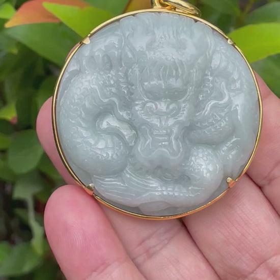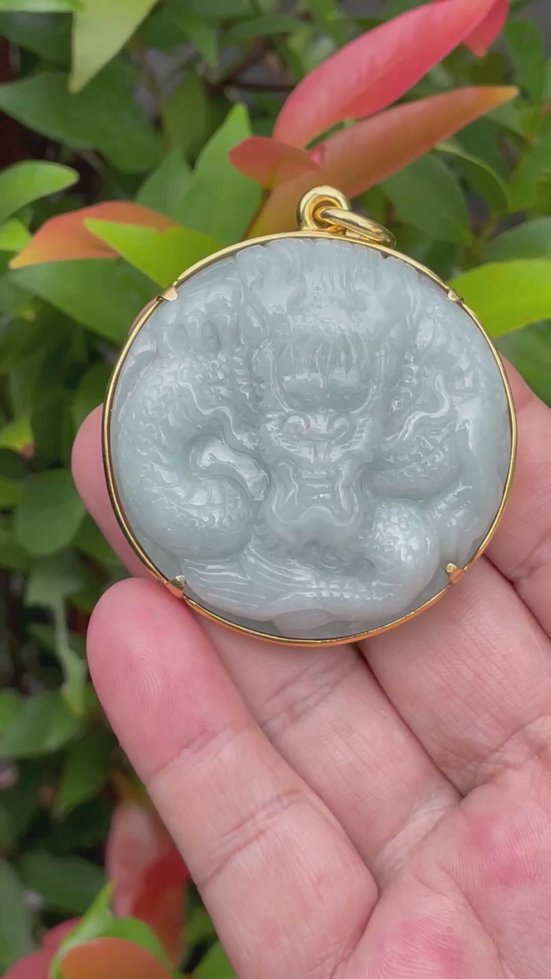 Natural Certified Burmese Jadeite Jade Pendant – Bluish Apple Green – Hand-Carved Dragon Motif – 24K Vermeil Gold Setting – JP034
