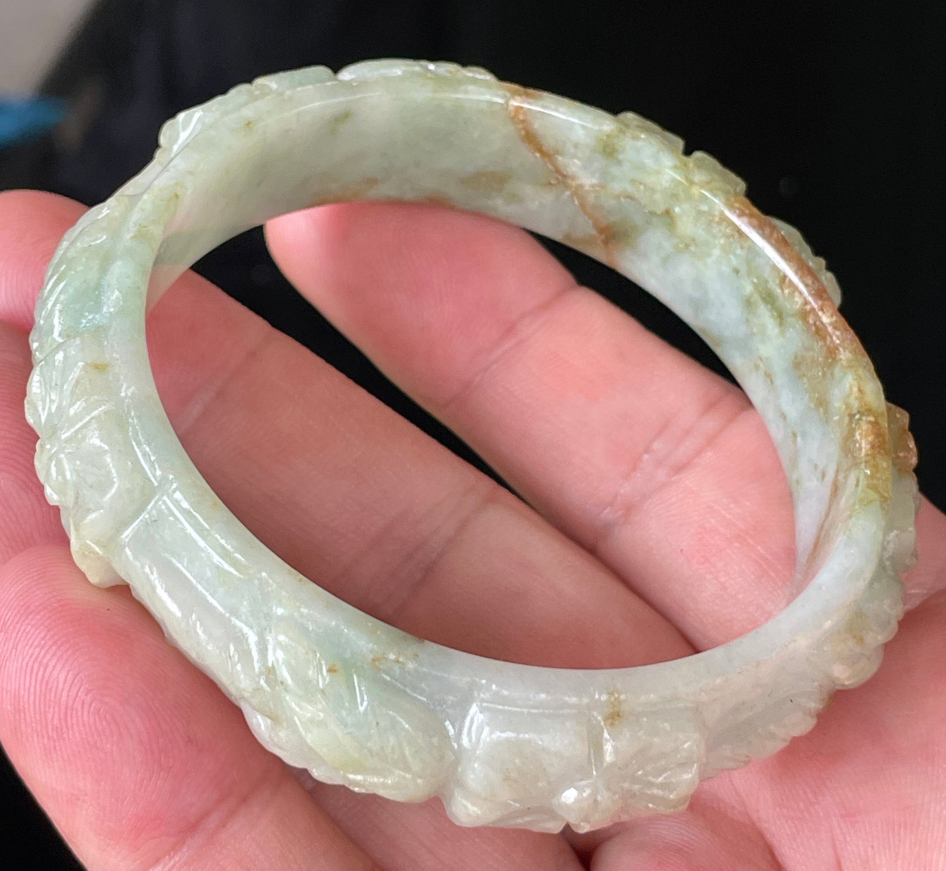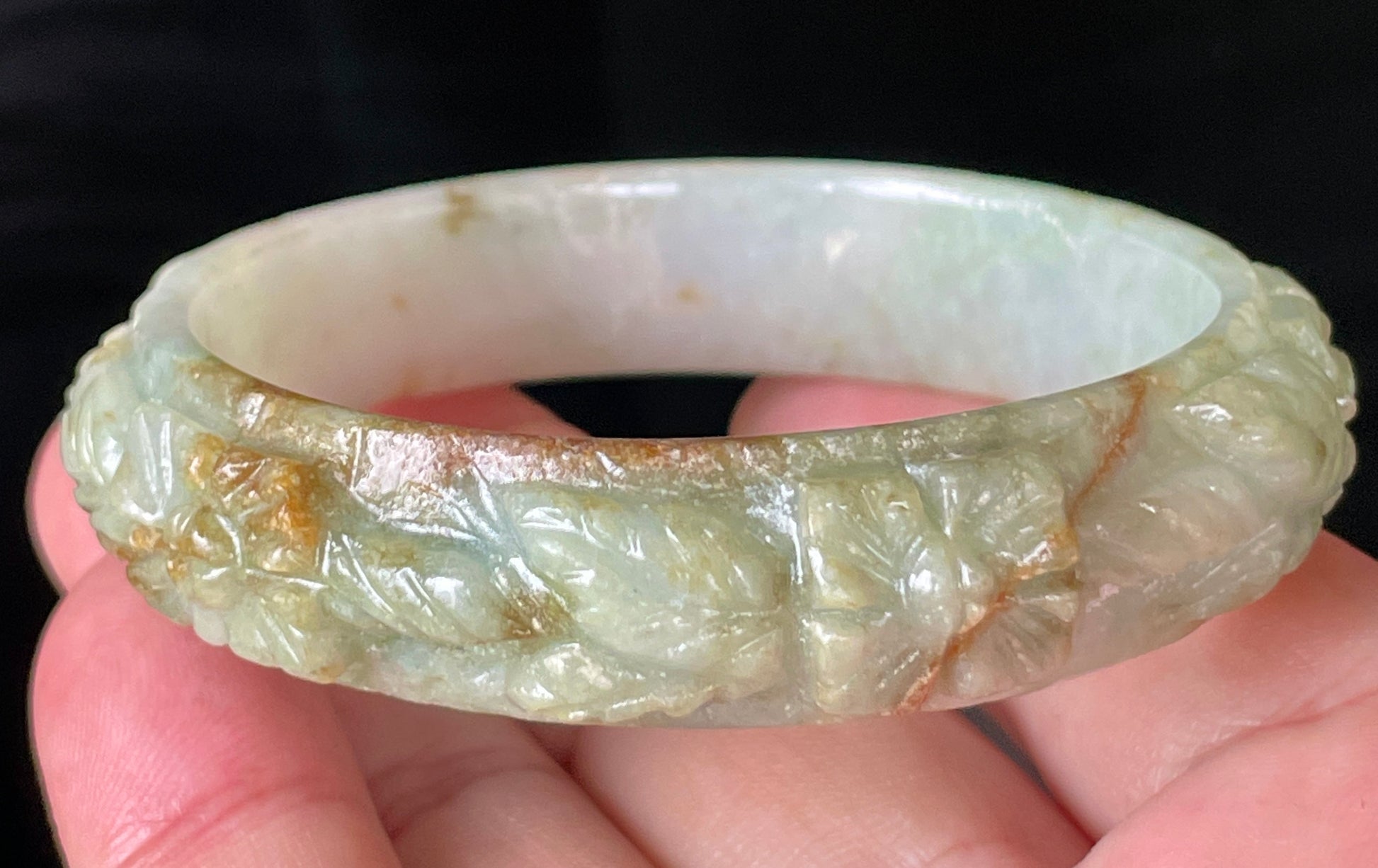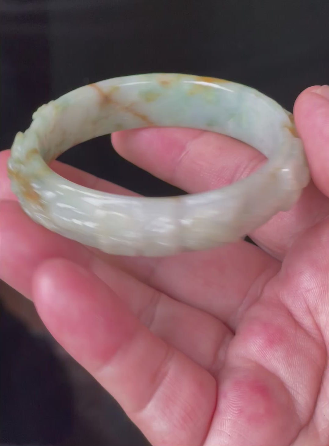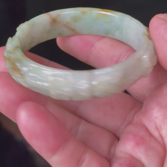 Natural Certified Burmese Jadeite Jade Bangle – Icy Apple Green with Milky White & Honey Orange Veins – Hand-Carved Floral Motif – 57mm – JB210