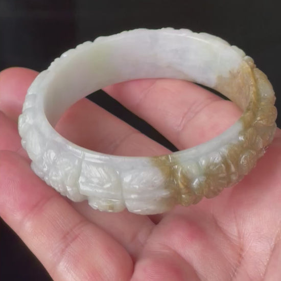 Natural Certified Burmese Jadeite Jade Bangle – Icy Forest Green, Honey Orange & Milky White – Hand-Carved Floral Motif – 58.7mm – JB206