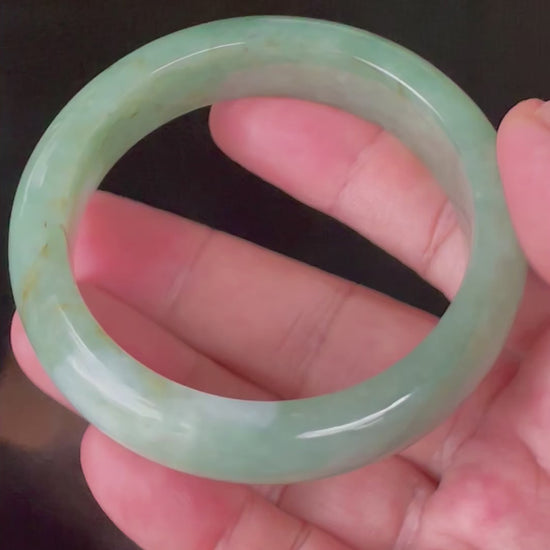 This certified jadeite jade bangle is expertly handcrafted from 100% natural Burmese jadeite. It displays a luminous blend of icy apple green and imperial green, gracefully accented with soft milky white and warm honey hues. Semi-translucent sections allow light to flow through, giving the bangle a glowing, radiant presence. Its glassy luster and fine crystalline structure highlight the exceptional quality of genuine Burmese jadeite.