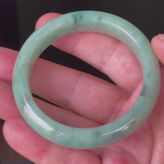The classic flat inner, round outer edge shape ensures comfortable wear and timeless style, while the unique coloring celebrates the rich artistry and cultural heritage of Burmese jadeite.