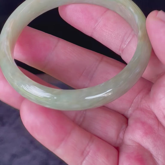 This is a luminous and elegant jadeite jade bangle, certified 100% genuine and natural jadeite from Myanmar (Burma). The bangle glows with a refreshing icy apple green hue, accented by soft crystalline texture and a semi-translucent body. Subtle natural stone lines and fine inclusions flow through the jade, enhancing its organic character and making every angle unique.
