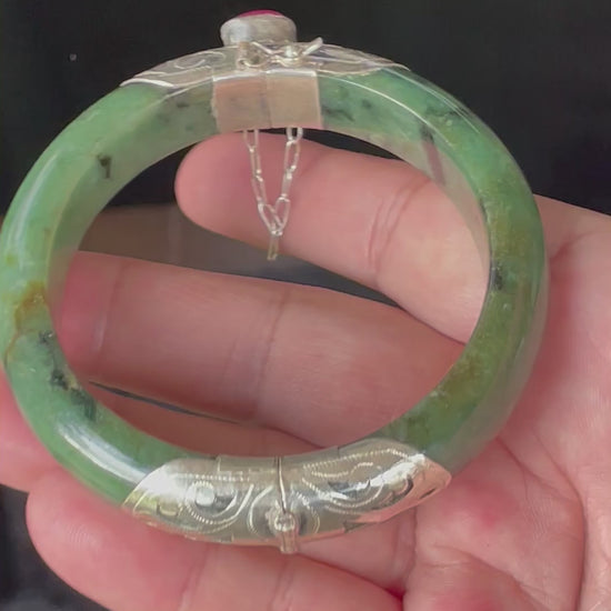 This certified jadeite jade bangle is expertly handcrafted from 100% genuine, natural jadeite sourced from Myanmar (Burma). It features an enchanting blend of icy deep apple green with striking black and honey hues. The bangle’s dynamic color play glows under natural light and is enhanced by a beautifully detailed 92.5 sterling silver adjustable clasp set with an authentic Burmese ruby gem, adding a luxurious and secure finishing touch.