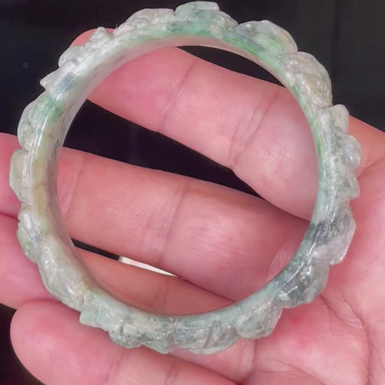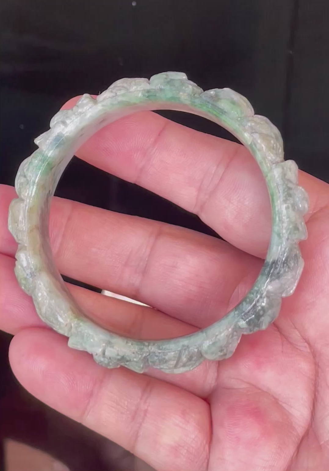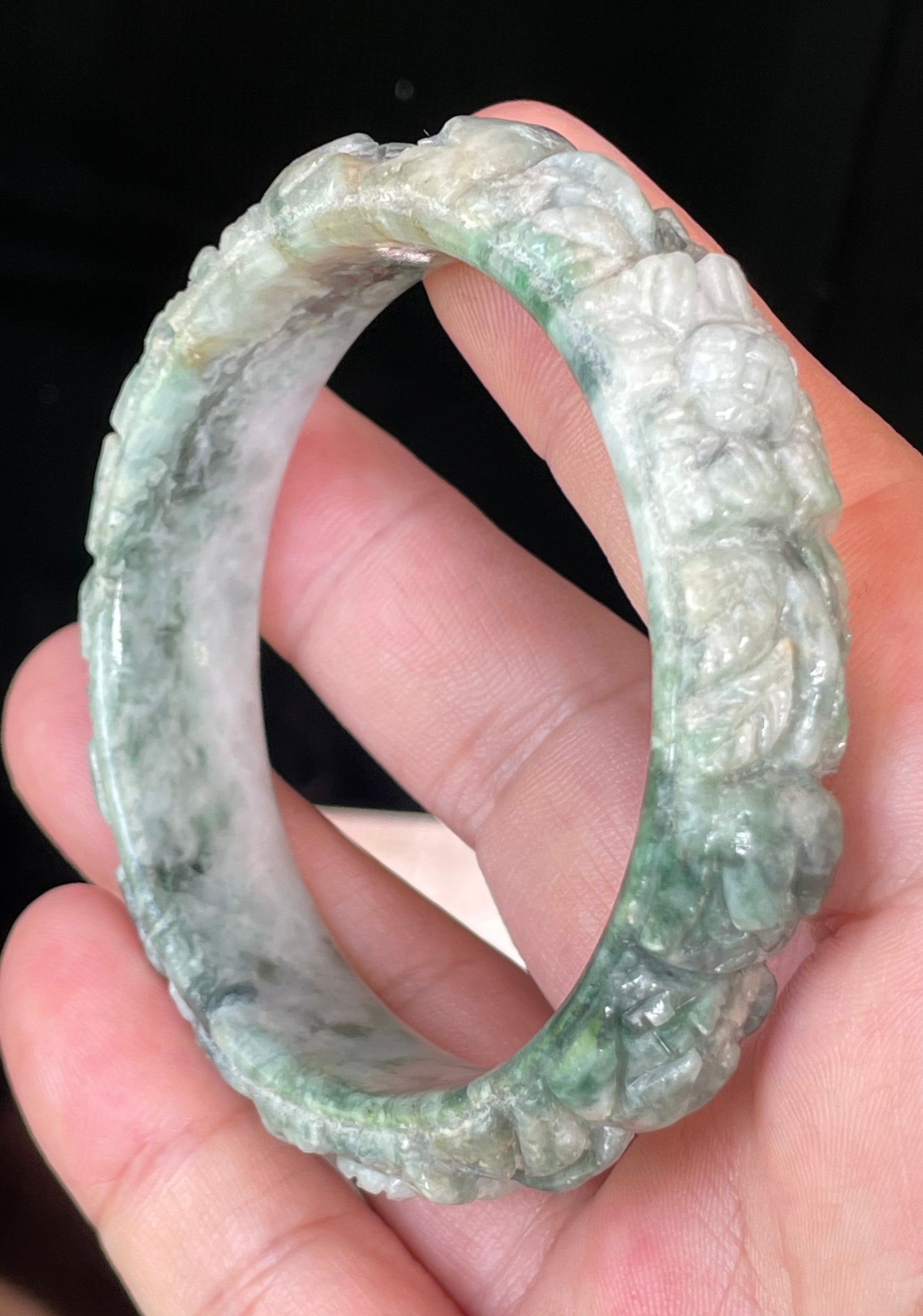 This bangle features a hand-carved floral motif symbolizing renewal, beauty, and continuous growth. Floral designs in jadeite jewelry are cherished across Asian cultures for their timeless elegance and positive energy, believed to attract abundance, harmony, and joy into the wearer’s life.