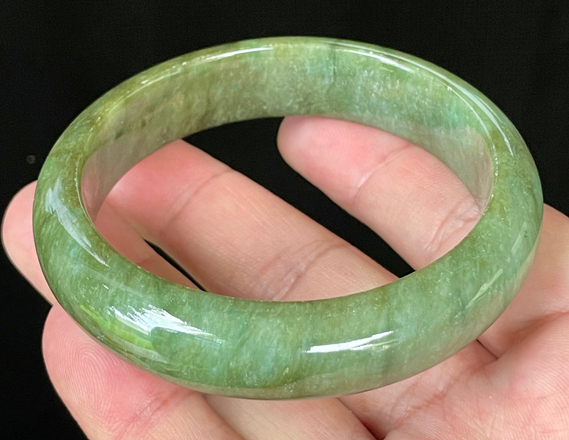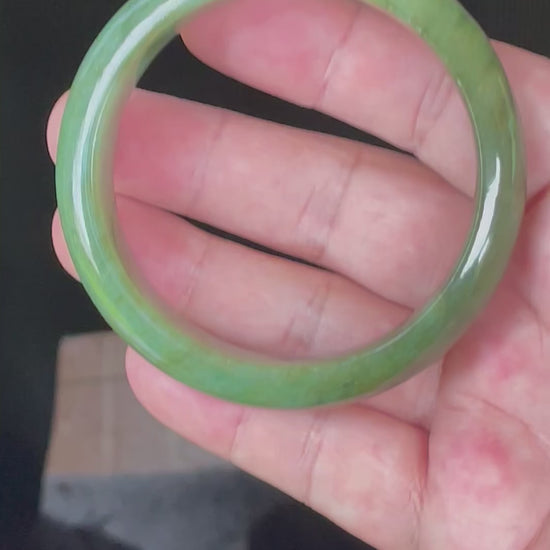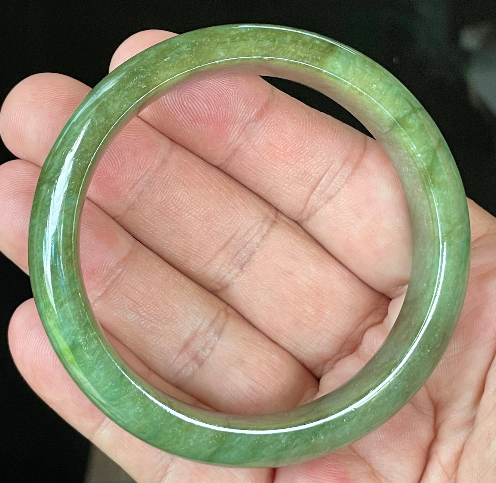 The even distribution of emerald and apple green in this piece lends it a sophisticated and energizing character, perfect for both daily wear and special occasions. Its flat inner, round outer edge profile ensures a comfortable fit and highlights the unique beauty of high-grade Burmese jadeite.