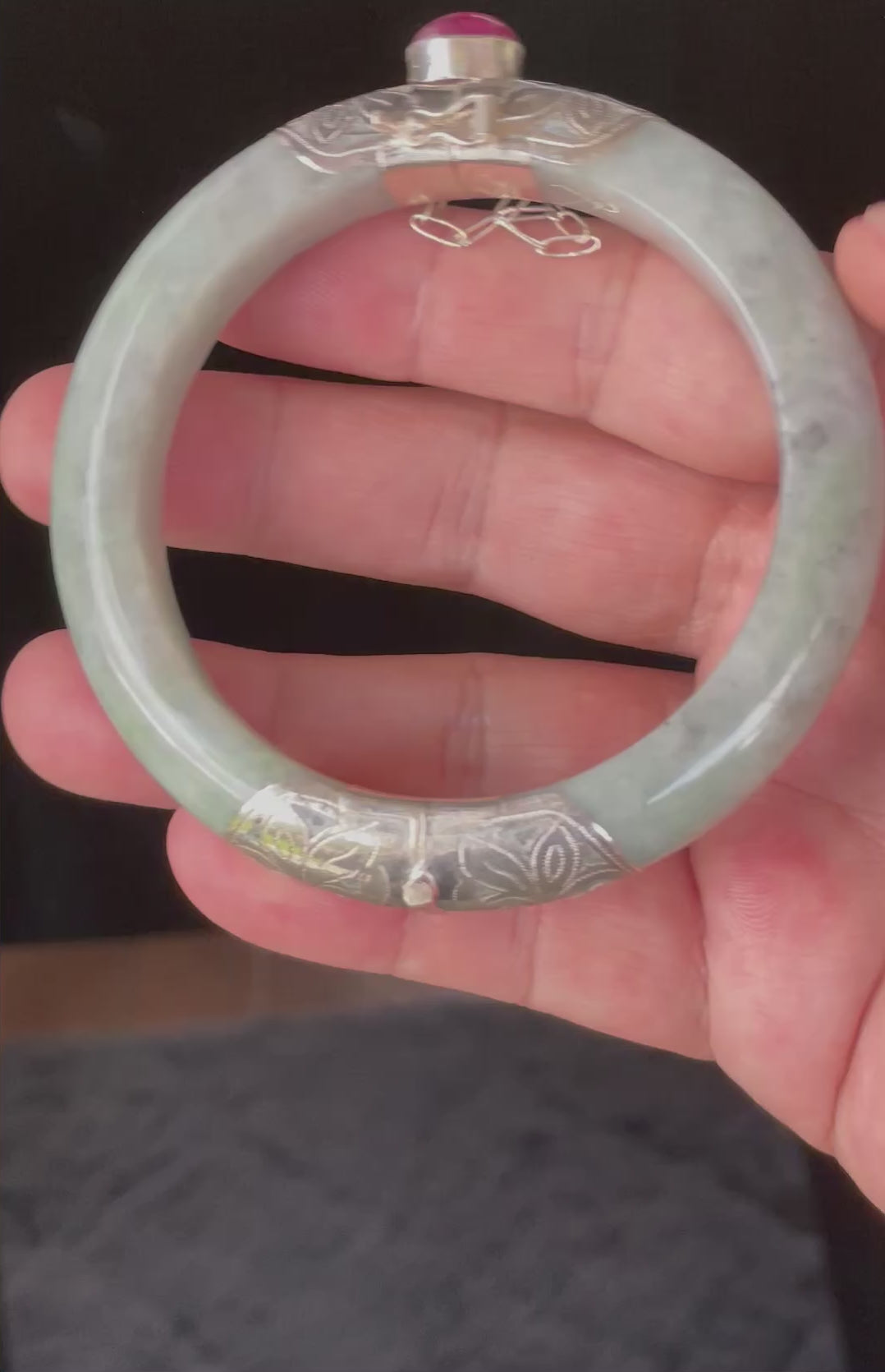 This certified jadeite jade bangle is expertly handcrafted from 100% genuine, natural jadeite sourced from Myanmar (Burma). It displays a tranquil combination of icy grey and milky white hues, highlighted by gentle translucency and a refined, glassy finish. The piece is accented with a beautifully detailed 92.5 sterling silver adjustable clasp set with an authentic Burma ruby, adding a touch of luxury and secure comfort to the bangle.
