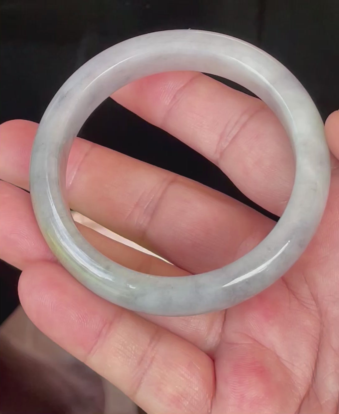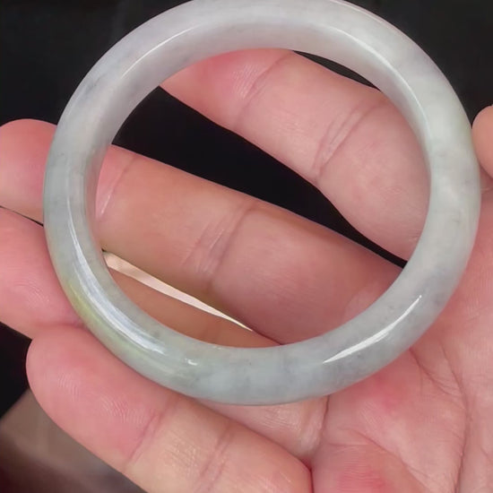 This certified jadeite jade bangle is expertly handcrafted from 100% genuine, natural jadeite sourced from Myanmar (Burma). The bangle displays a luminous blend of icy grey and soft milky white with subtle honey hues marbled through its fine crystalline structure. Its semi-translucent body glows beautifully in natural light, creating a serene and refined look that feels elegant on the wrist.