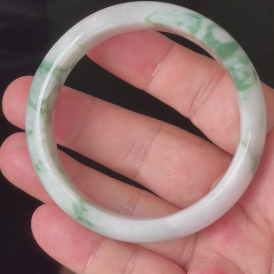 This certified jadeite jade bangle is masterfully handcrafted from 100% genuine, natural jadeite sourced from Myanmar (Burma). The bangle features a luminous mix of icy greyish milky white and distinctive imperial green hues with delicate natural stone lines, creating an elegant, serene look that glows beautifully in natural light.