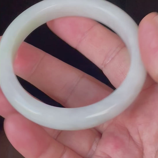 This certified jadeite jade bangle is skillfully handcrafted from 100% genuine, natural jadeite sourced directly from Myanmar (Burma). The bangle features an elegant, softly translucent blend of icy greyish milky white with delicate apple green hues subtly flowing throughout its fine crystalline texture. The soothing grey-white body provides a serene, sophisticated backdrop for the gentle pops of fresh green, giving the piece a luminous, calming character in any light.