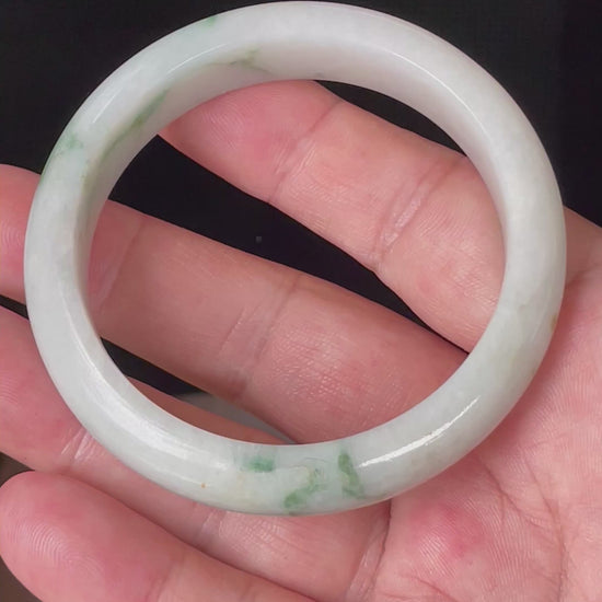 This certified jadeite jade bangle is expertly handcrafted from 100% genuine, natural jadeite sourced from Myanmar (Burma). The bangle showcases an elegant blend of icy greyish milky white tones, softly marbled with subtle imperial green and warm honey hues. Its refined semi-translucent body glows beautifully in natural daylight, while the natural stone veins and color patterns give this piece a truly unique character.