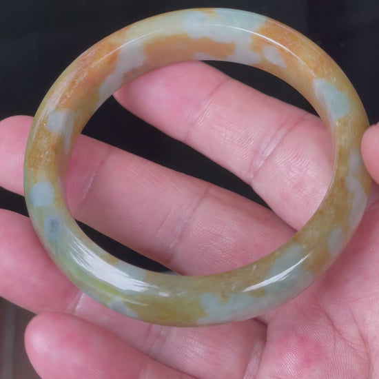 This certified jadeite jade bangle is masterfully handcrafted from 100% genuine, natural jadeite sourced from Myanmar (Burma). The bangle showcases a vibrant marbling of icy honey and golden brown tones accented by cool patches of bluish milky white. Its crystalline structure and glassy luster make the colors glow beautifully in natural light, creating a look that is both earthy and refreshing.
