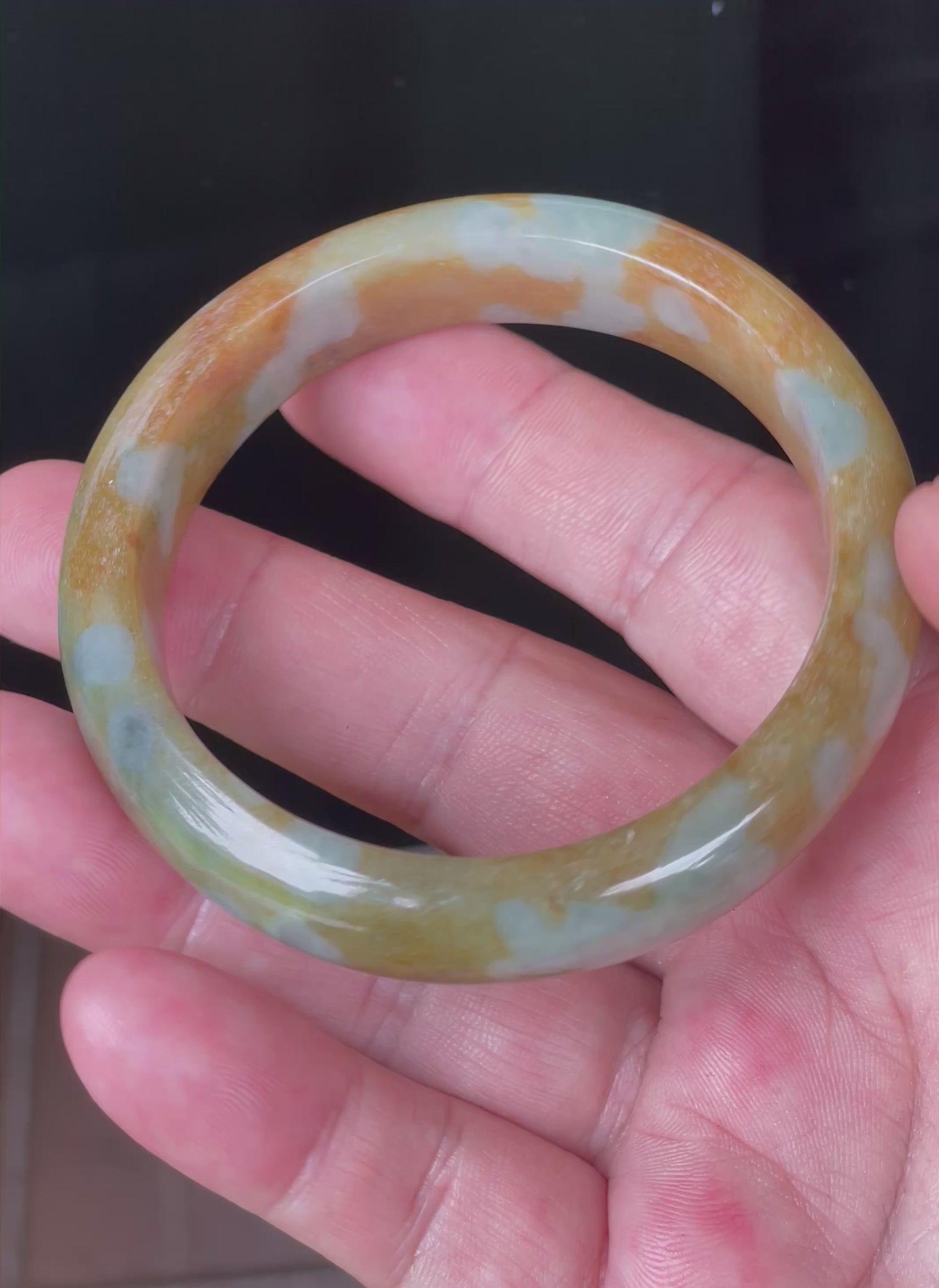 Natural Certified Burmese Jadeite Jade Bangle – Icy Honey & Brown with Bluish Milky White Hues – 58.4mm – JB075