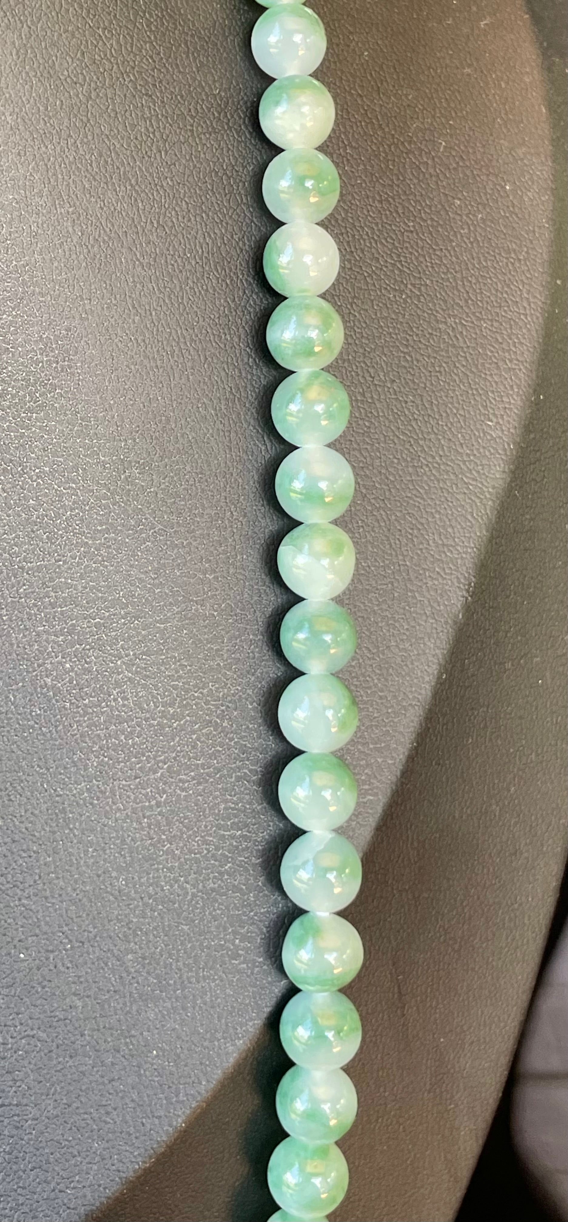 This certified jadeite jade beaded necklace showcases a serene palette of icy imperial white with apple green inclusions, a style often referred to as “Moss in the Snow.” The contrast between the cool white translucency and the mossy green hues creates an elegant yet organic feel—perfect for collectors who value subtle beauty and symbolism.