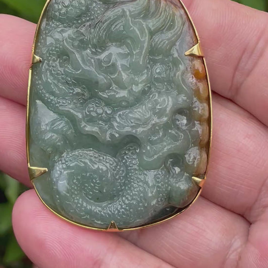 Natural Certified Burmese Jadeite Jade Pendant – Imperial Green & Honey Brown – Hand-Carved Dragon Motif – 24K Vermeil Gold Setting – JP062