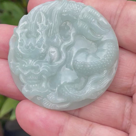 The front is intricately carved with a powerful dragon, capturing bold facial features, dramatic horns, and coiling movement. The reverse is smoothly polished to enhance comfort and highlight the fine quality of the jade.