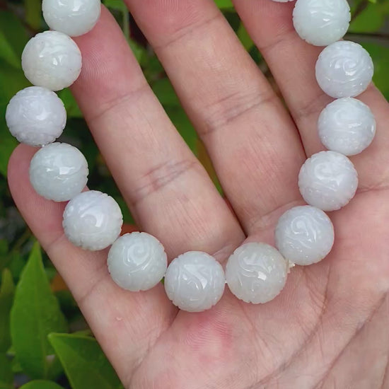 This bracelet is handcrafted from 100% genuine and natural jadeite jade, ethically sourced from Myanmar (Burma), home to the world’s most prized jadeite. Each 13.4mm bead is meticulously hand-carved with swirling motifs, lending both texture and symbolism to this exquisite piece.