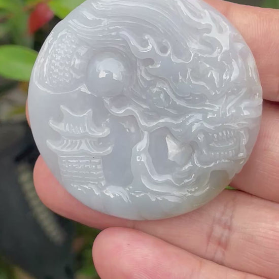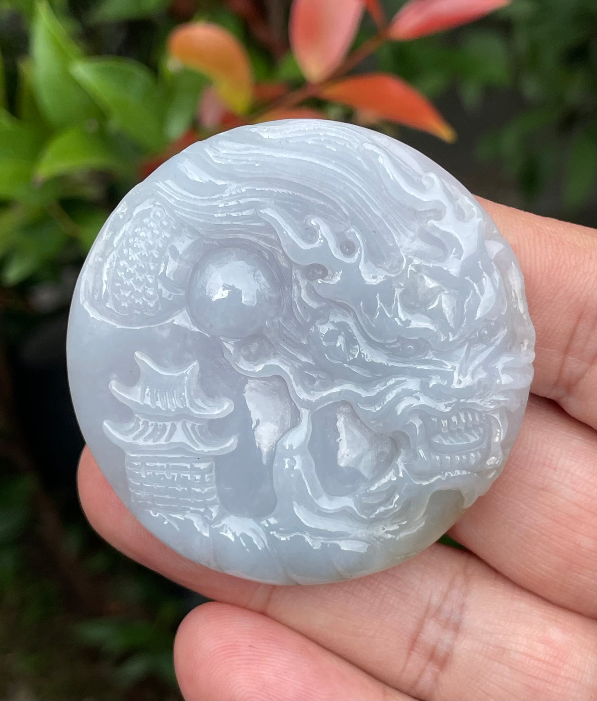 Natural Certified Burmese Jadeite Jade Pendant – Icy Lavender, Milky White & Moss Green – Hand-Carved Dragon Motif – JP050