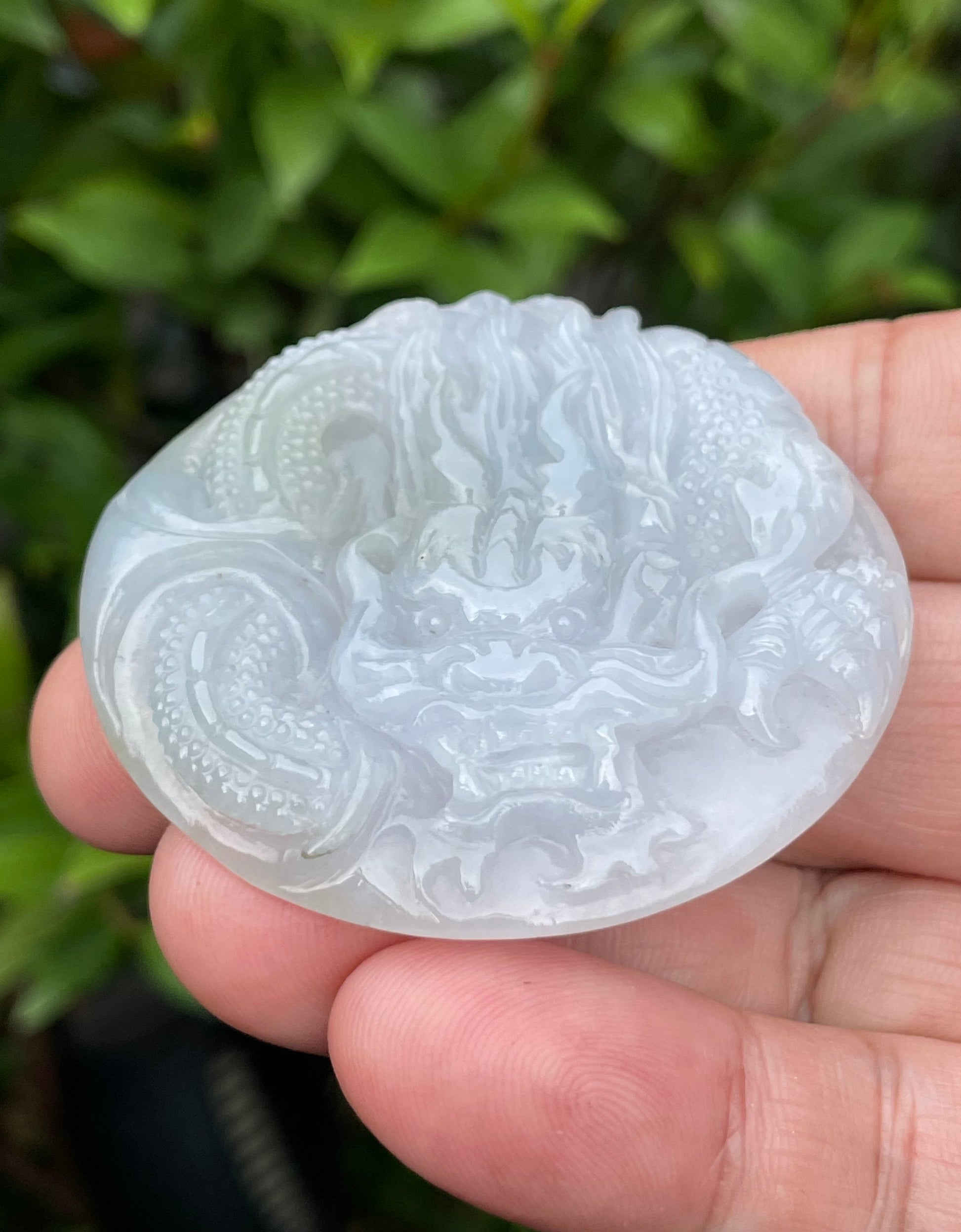 The front displays a striking hand-carved dragon, its face etched with fierce energy and precision. The dragon’s form coils upward through the translucent jade, while the reverse features a beautifully carved flame-like tail—highlighting the pendant's craftsmanship and symbolic balance.