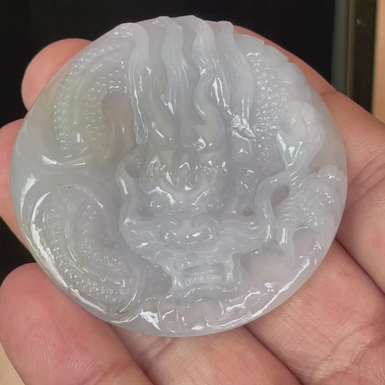 Natural Certified Burmese Jadeite Jade Pendant – Icy Lavender, Moss Green & Milky White – Hand-Carved Dragon Motif – JP051
