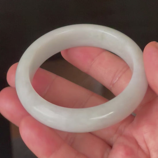 This certified jadeite jade bangle is expertly handcrafted from 100% genuine, natural jadeite sourced from Myanmar (Burma). The bangle displays a soothing blend of icy light apple green and milky white hues swirling gracefully throughout its fine crystalline texture. Its slightly translucent body glows in natural light, with gentle greens and whites that evoke a sense of purity, freshness, and calm.