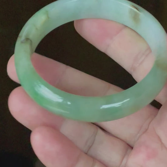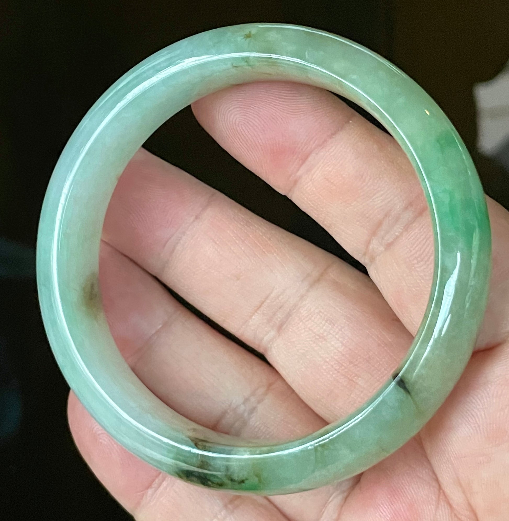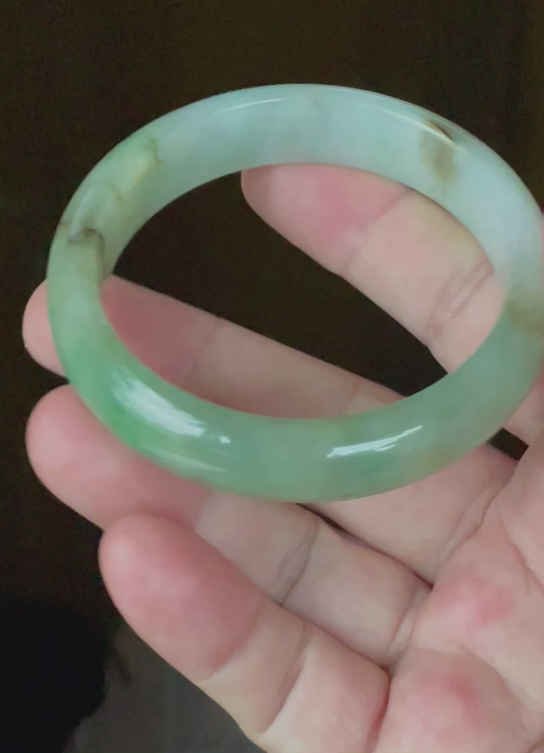 This certified jadeite jade bangle is expertly handcrafted from 100% genuine, natural jadeite sourced from Myanmar (Burma). It displays a harmonious combination of icy light bluish milky white with vibrant imperial green and apple green, accented by subtle honey hues. The luminous greens and soft white tones shift beautifully under natural light, giving this bangle an uplifting and sophisticated character. Distinctive natural stone lines are visible, a hallmark of authentic jadeite, enhancing its natural beauty and uniqueness.
