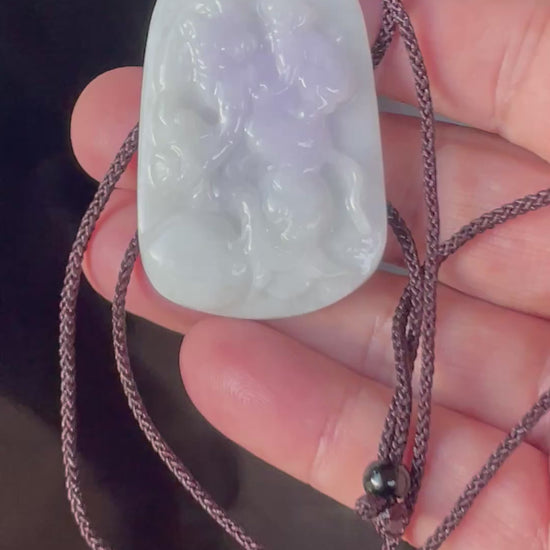 This pendant is carved from 100% genuine and natural jadeite jade, ethically sourced from Myanmar (Burma)—renowned for producing the world’s finest jadeite. It features an enchanting blend of icy milky white and lavender hues, hand-carved into a charming two monkey motif.