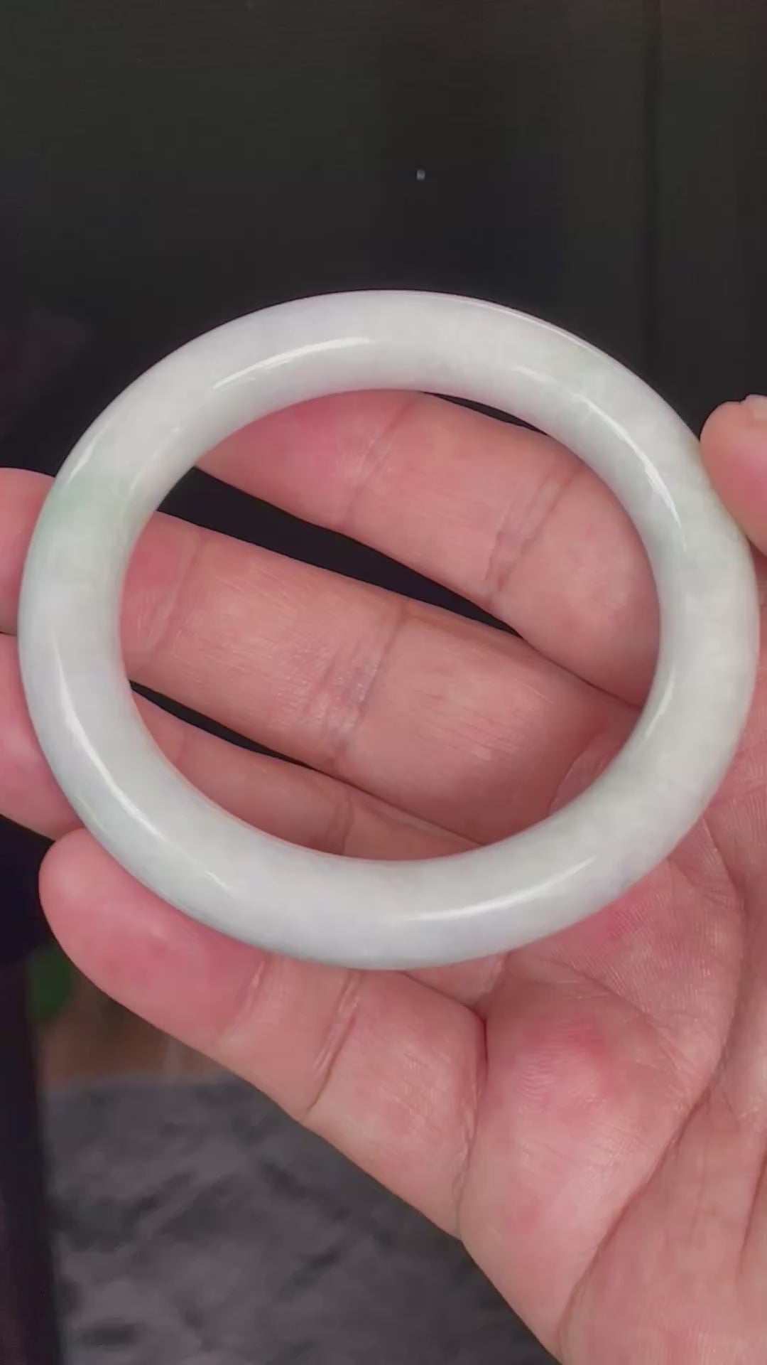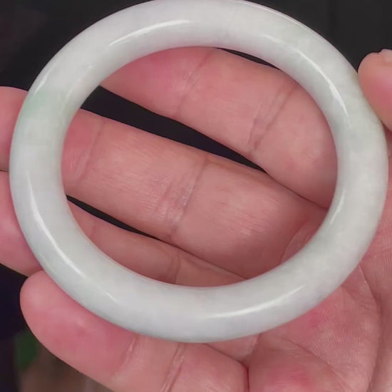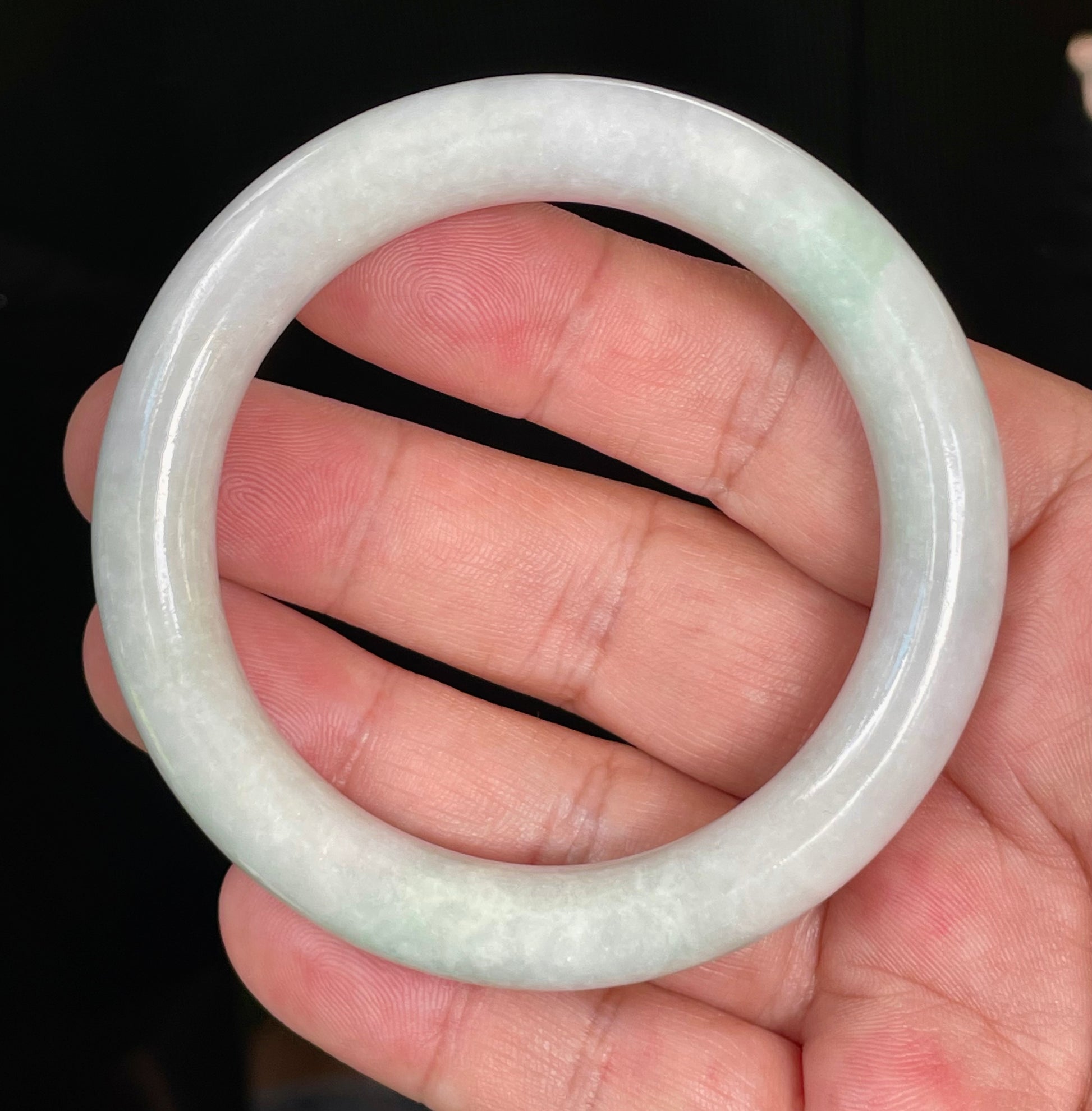 This striking bangle is hand-carved from 100% genuine and natural jadeite jade sourced from Myanmar (Burma), celebrated for its high-quality jadeite. The bangle features a serene combination of icy milky white and elegant imperial green hues, with softly blended colors and a fine crystalline texture. Semi-translucent and luminous, this piece is both understated and eye-catching.
