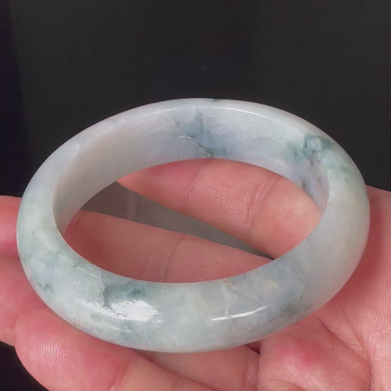 This certified jadeite jade bangle is exquisitely handcrafted from 100% genuine, natural jadeite sourced in Myanmar (Burma). The bangle features a luminous base of icy milky white beautifully marbled with elegant imperial green and delicate apple green tones in a fine crystalline texture. Its semi-translucent body glows softly in natural light, creating a serene and uplifting look for the wrist.