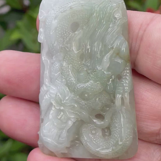 Natural Certified Burmese Jadeite Jade Pendant – Icy Moss Green & Milky White – Hand-Carved Dragon Motif – JP058