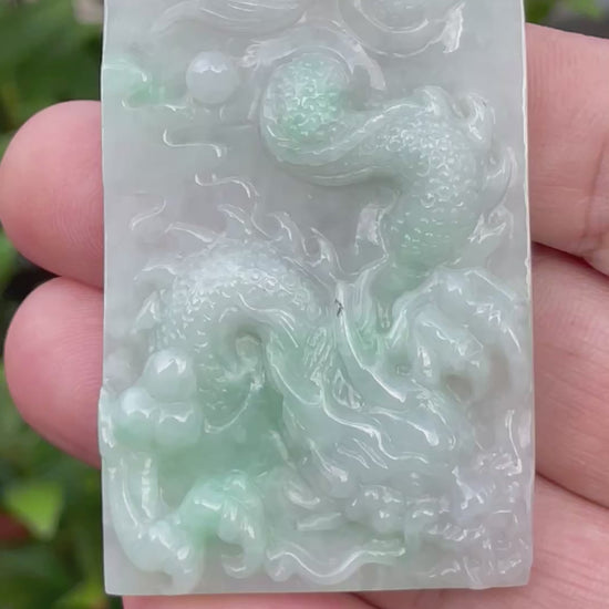This jade pendant is carved from 100% genuine and natural jadeite jade, ethically sourced from Myanmar (Burma)—the most esteemed origin for high-quality jadeite. It features a glowing mix of icy white and imperial green, with beautifully layered natural inclusions. The surface is intricately hand-carved into a flowing dragon, giving the pendant a bold and majestic presence.