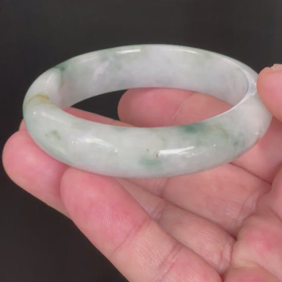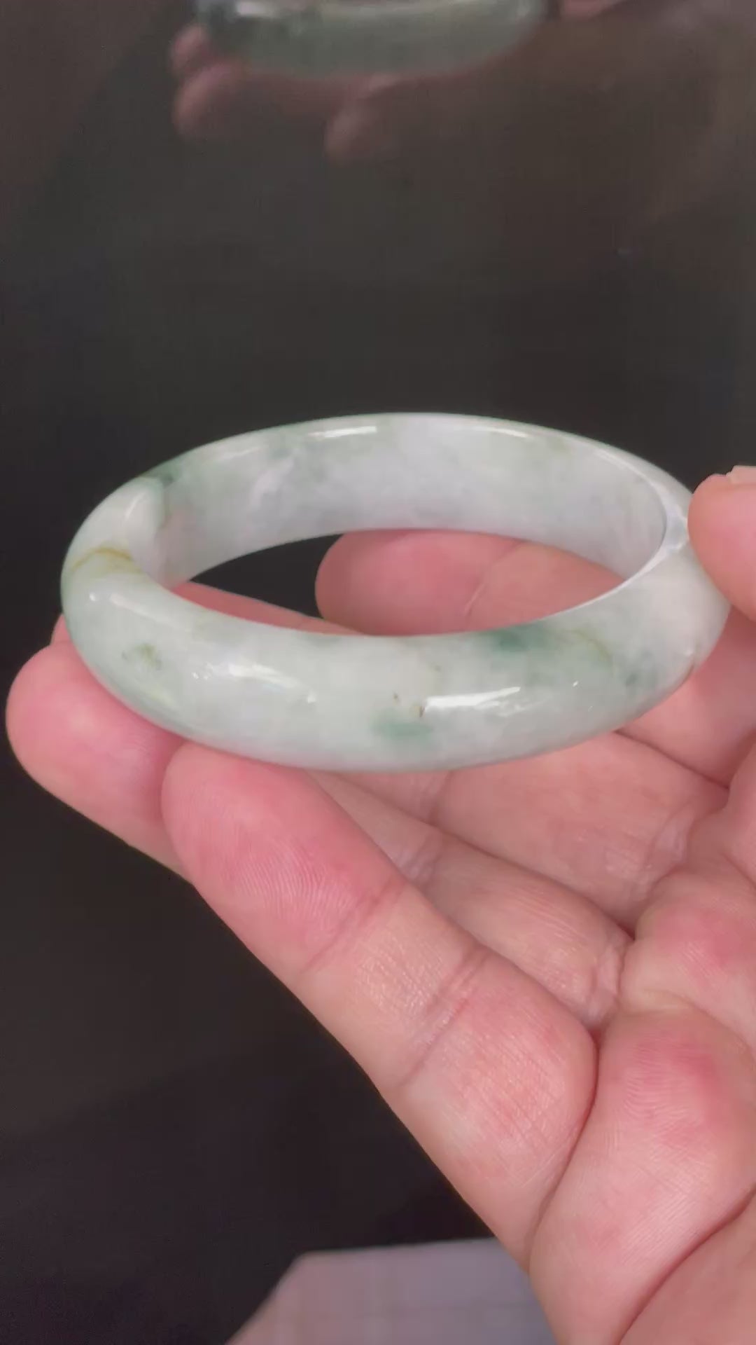 The beautiful colors transition harmoniously throughout the bangle, giving it a serene, refreshing presence and a fine crystalline texture that glows in natural light. A faint “moss in the snow” effect can also be seen.The classic flat inner, rounded outer edge profile ensures both comfort and timeless beauty for everyday wear.