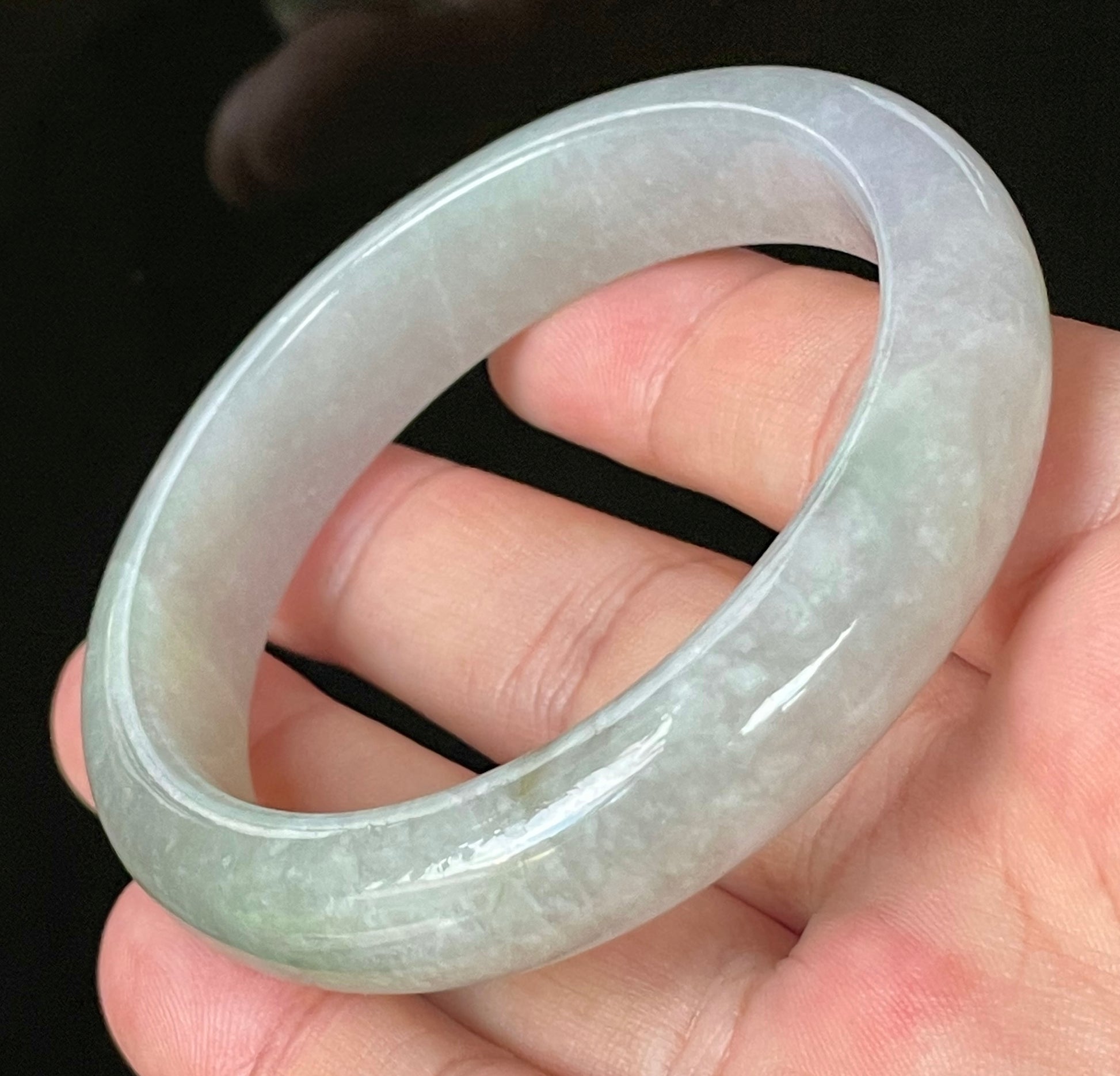 The harmonious interplay of lavender, white, and green brings a calming, elegant character to this piece—ideal for both everyday wear and special occasions. Its flat inner, round outer edge profile ensures a comfortable fit while highlighting the artistry of fine Burmese jade. Some natural jade stone lines are present, which are a testament to the authenticity and unique nature of this bangle.