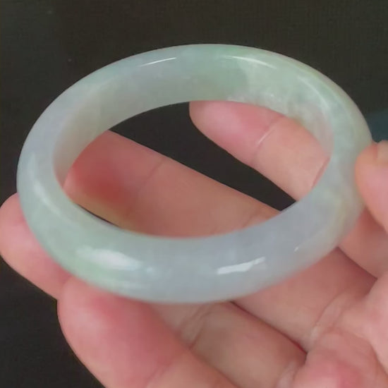 This certified jadeite jade bangle is meticulously handcrafted from 100% genuine, natural jadeite sourced directly from Myanmar (Burma). It features an exquisite blend of very icy light lavender and milky white with refreshing apple green hues. The icy clarity and cool pastel tones create a serene, ethereal look, while the crystalline texture shimmers in natural light.