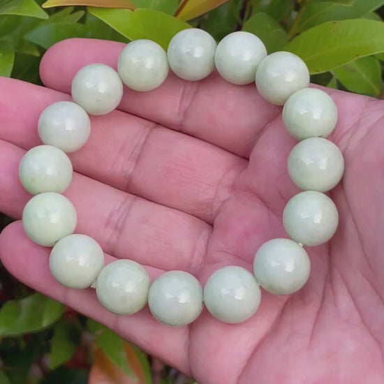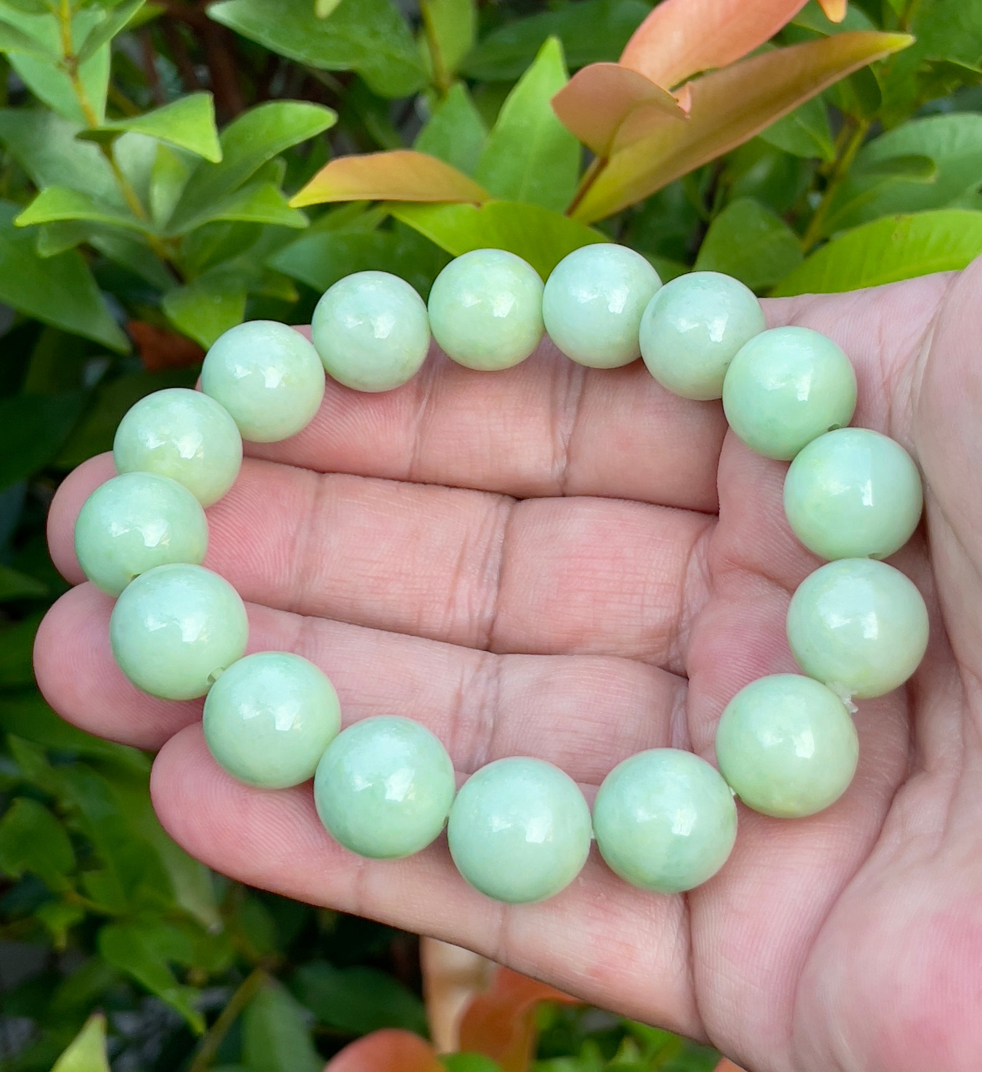 Each 13.4mm round bead has been expertly polished to a glossy finish, showcasing delicate variations in color and structure. The blend of soft greens and whites brings an air of tranquility and elegance, making this bracelet a meaningful statement piece for everyday wear or spiritual practice.