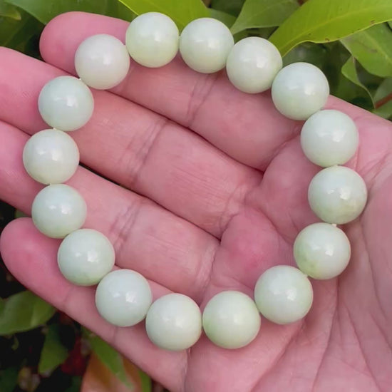 Each 13.4mm bead is smoothly polished to highlight the bracelet’s natural translucence and vibrant texture. The combination of soft greens and snowy white evokes harmony, purity, and gentle strength—ideal for both everyday elegance and moments of reflection.