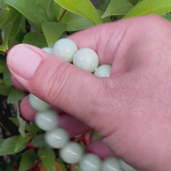 Each 13.4mm bead is smoothly polished to highlight the bracelet’s natural translucence and vibrant texture. The combination of soft greens and snowy white evokes harmony, purity, and gentle strength—ideal for both everyday elegance and moments of reflection.