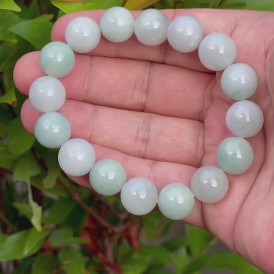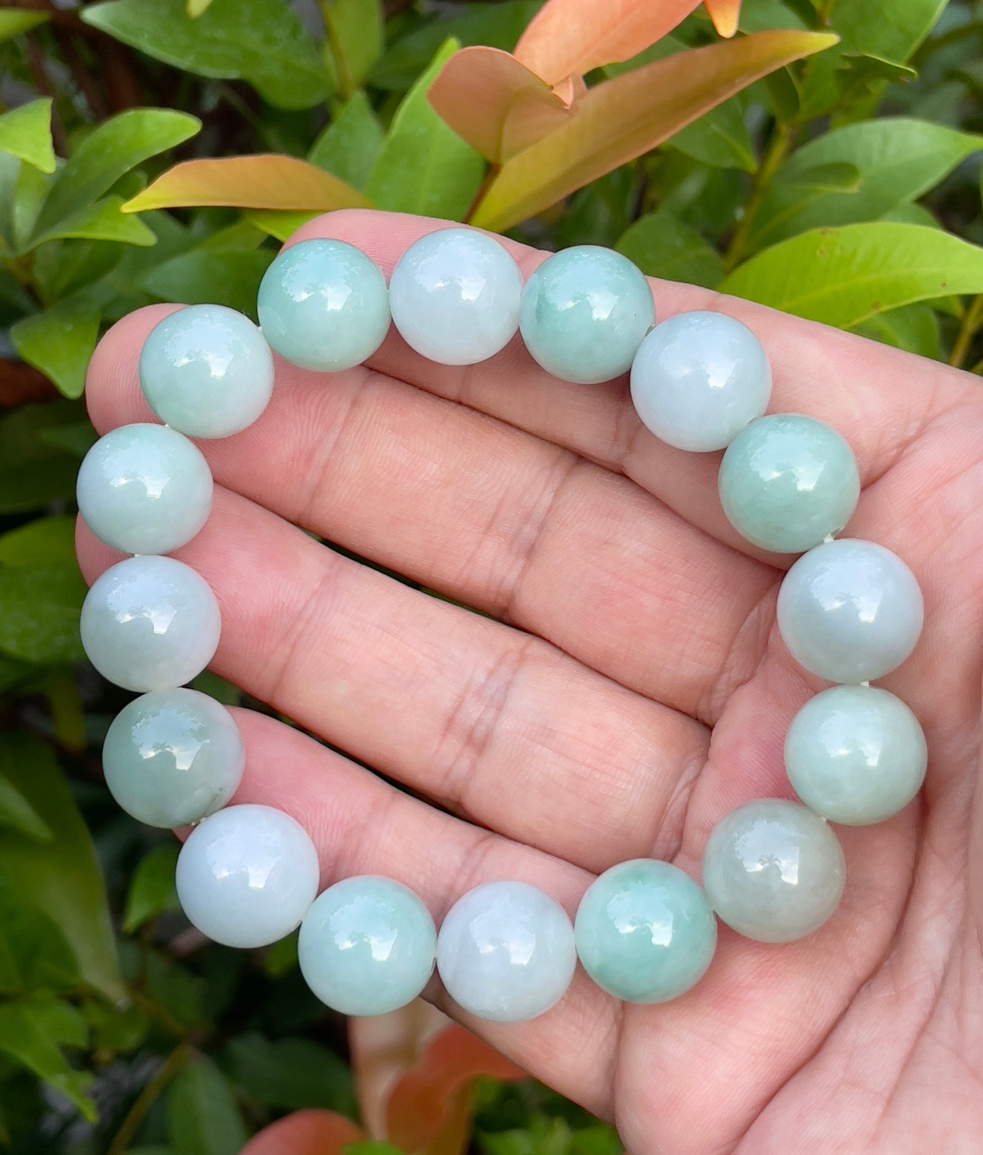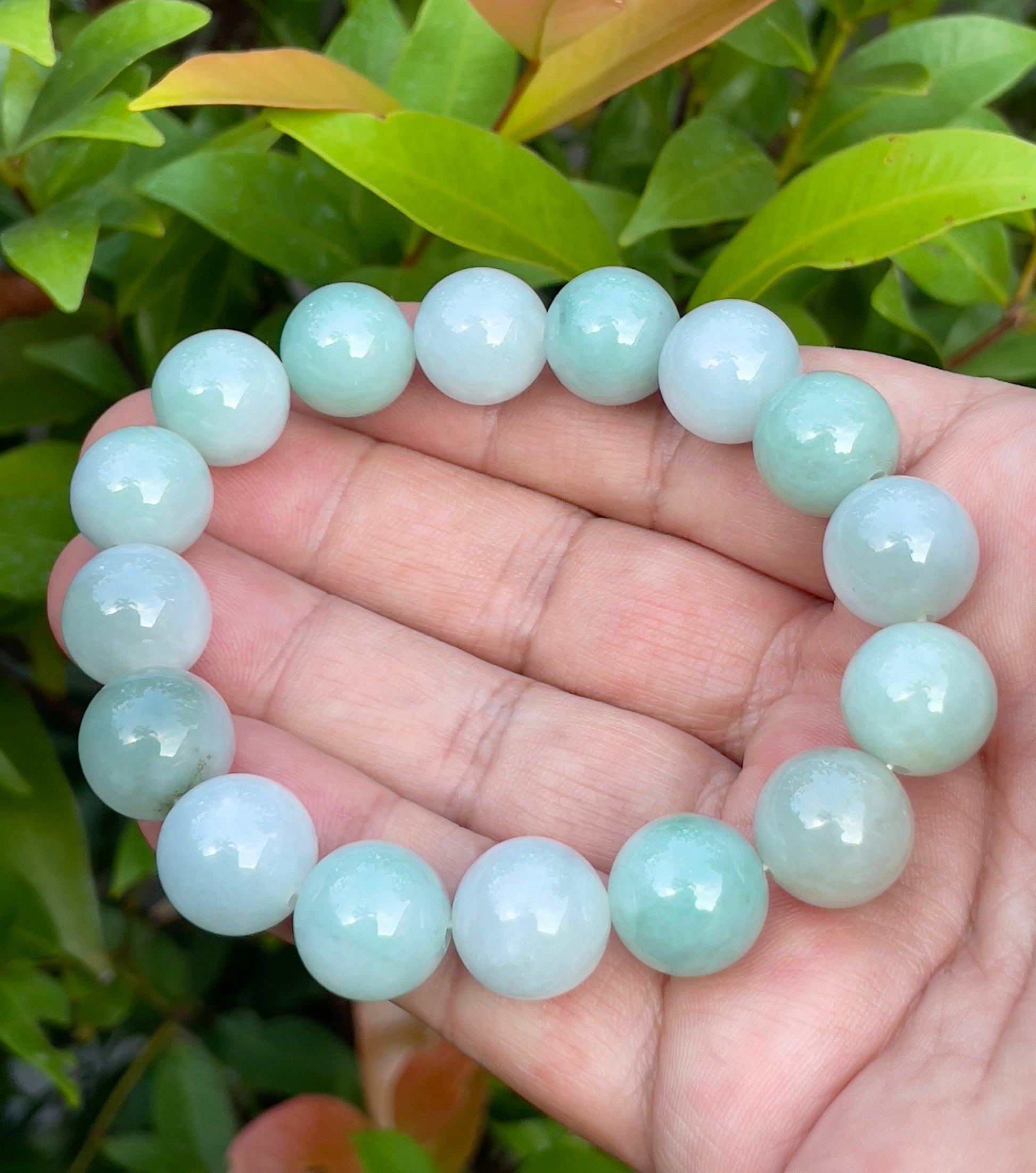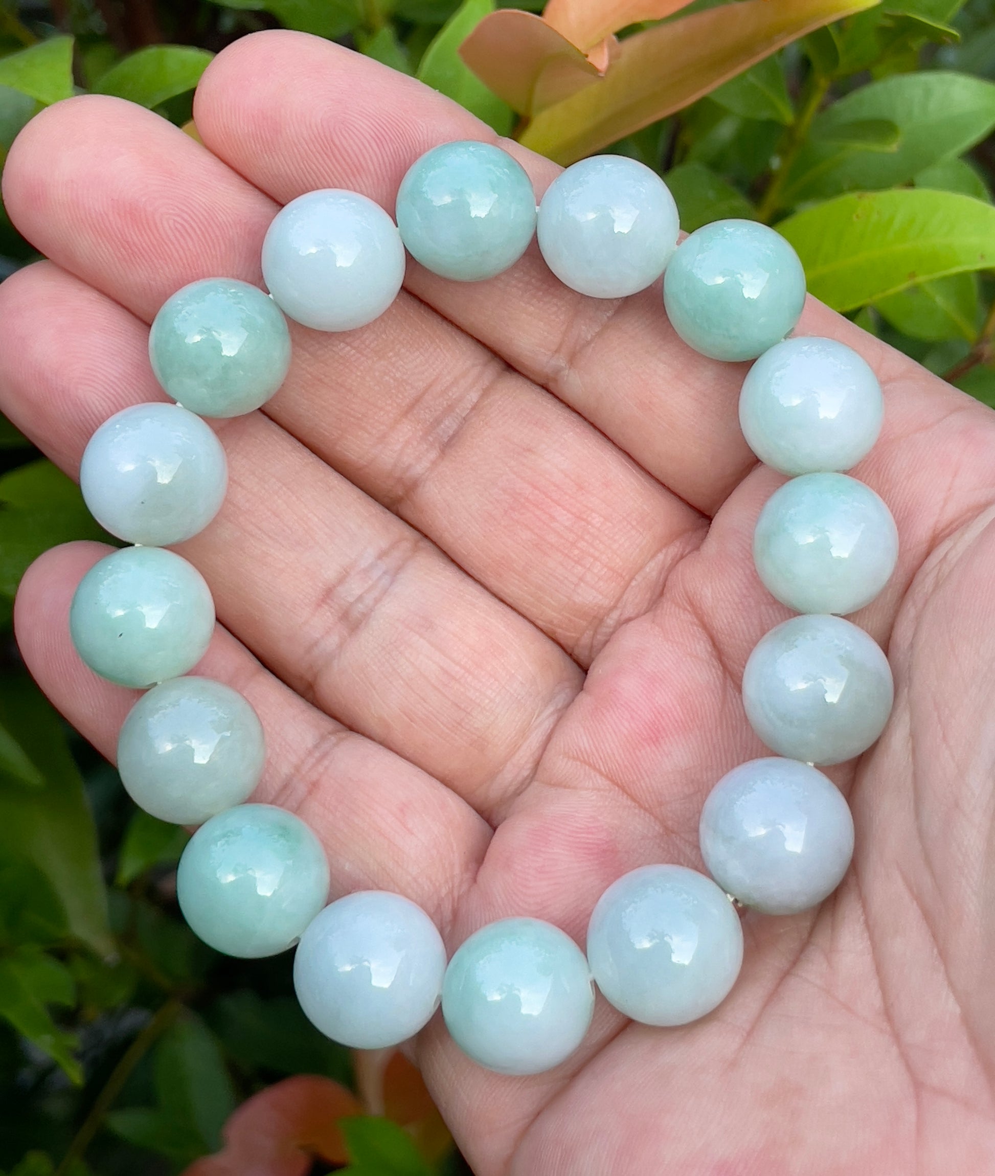 Each 13.4mm bead is meticulously polished to a glossy finish, revealing subtle variations in translucency and tone. The soft, watery greens merge effortlessly with the milky white base, making this bracelet a perfect match for anyone seeking peaceful elegance and spiritual clarity in their jewelry.