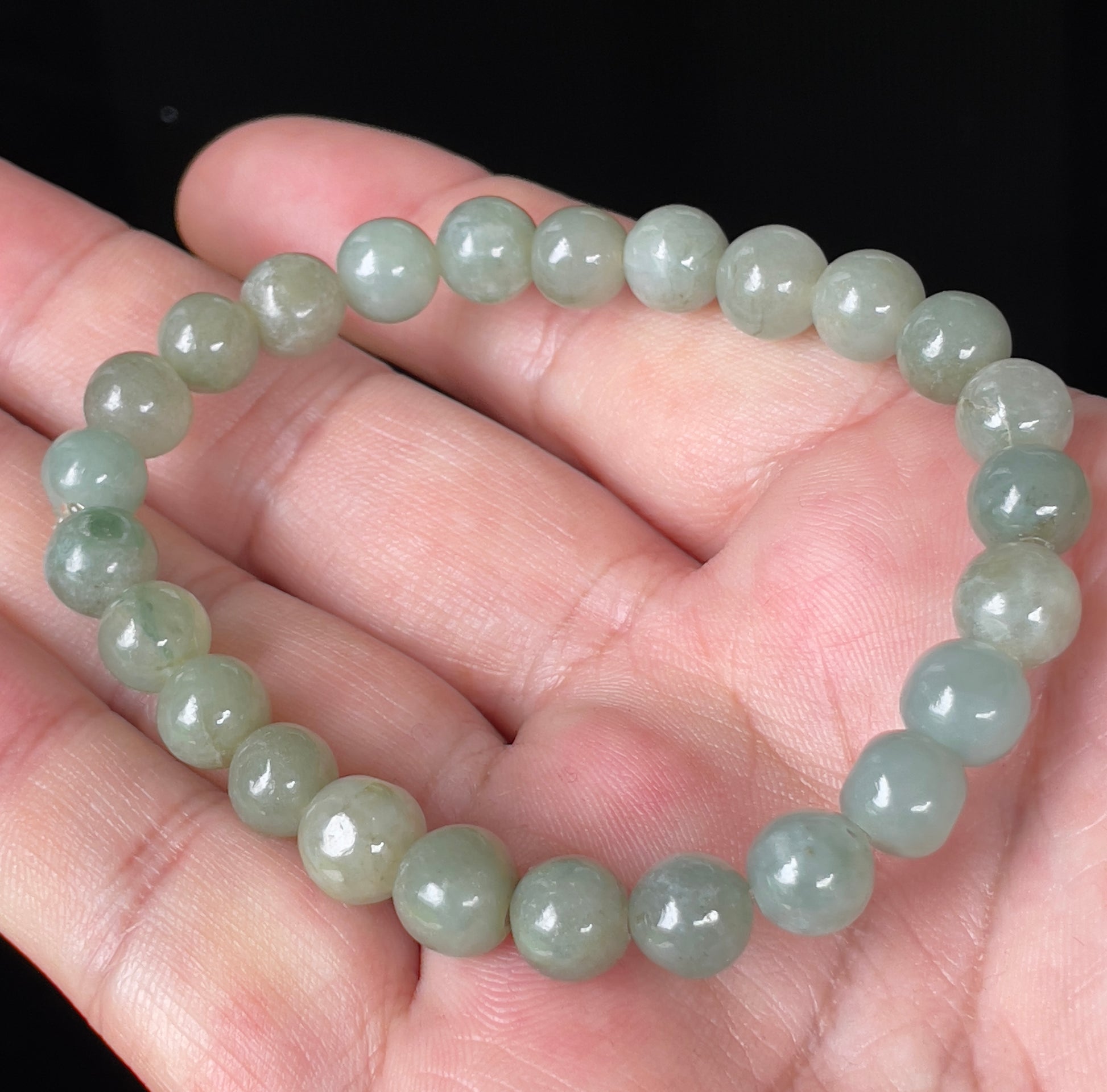 This elegant bracelet is handcrafted using 100% genuine and natural jadeite jade, sourced from Myanmar (Burma), the most revered origin of fine jadeite. Each 8mm bead is hand-shaped and polished to reveal a luminous icy apple green tone, reflecting natural variations and translucency that make each piece unique.