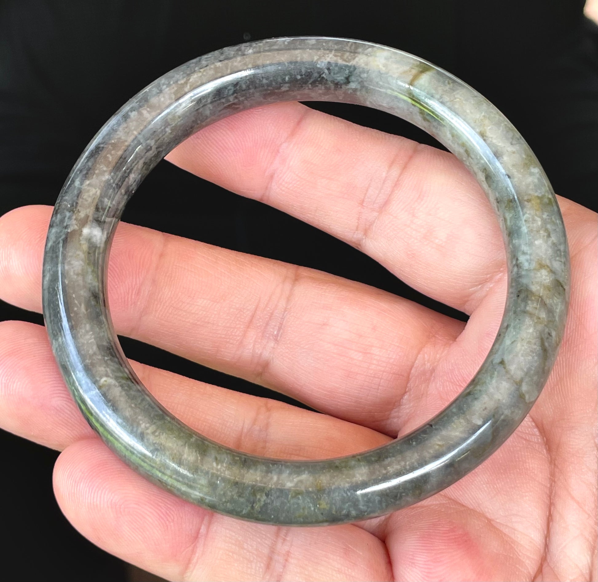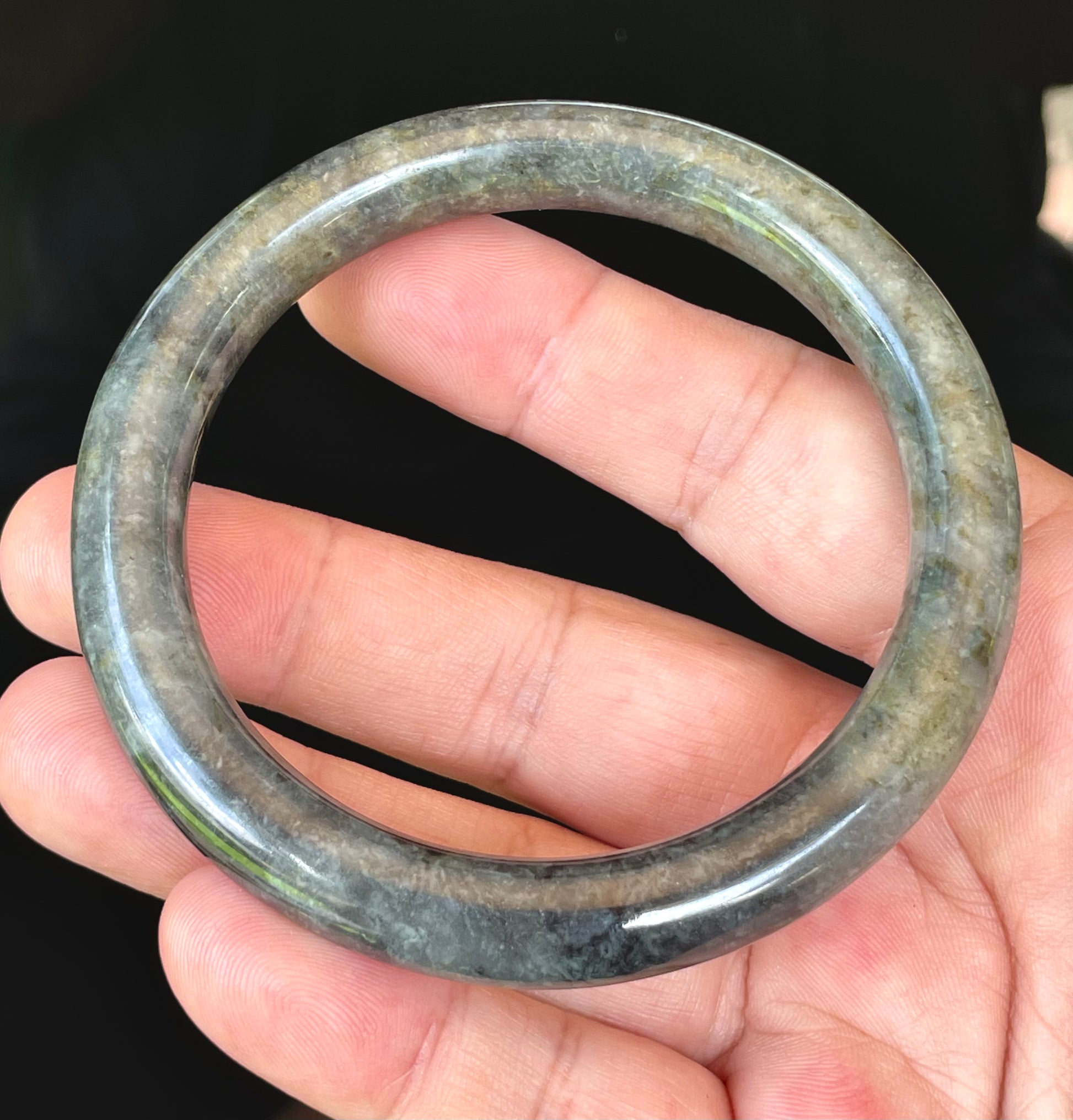 Natural Burmese Jadeite Jade Bangle – Icy Black, Grayish Milky White & Moss Green – Princess Cut – 62.5mm – JB404