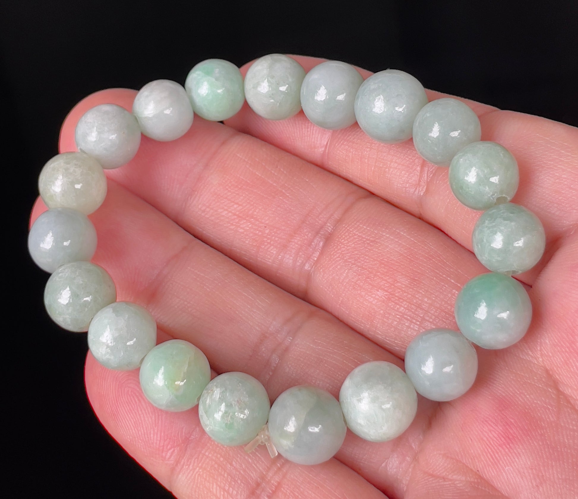 This bracelet is handcrafted from 100% genuine and natural jadeite jade, ethically sourced from Myanmar (Burma). Each 10.5mm round bead has been hand-shaped to retain its organic beauty and natural charm. The bracelet showcases a luminous blend of icy bluish apple green and milky white tones, offering an elegant and refreshing palette full of tranquility.