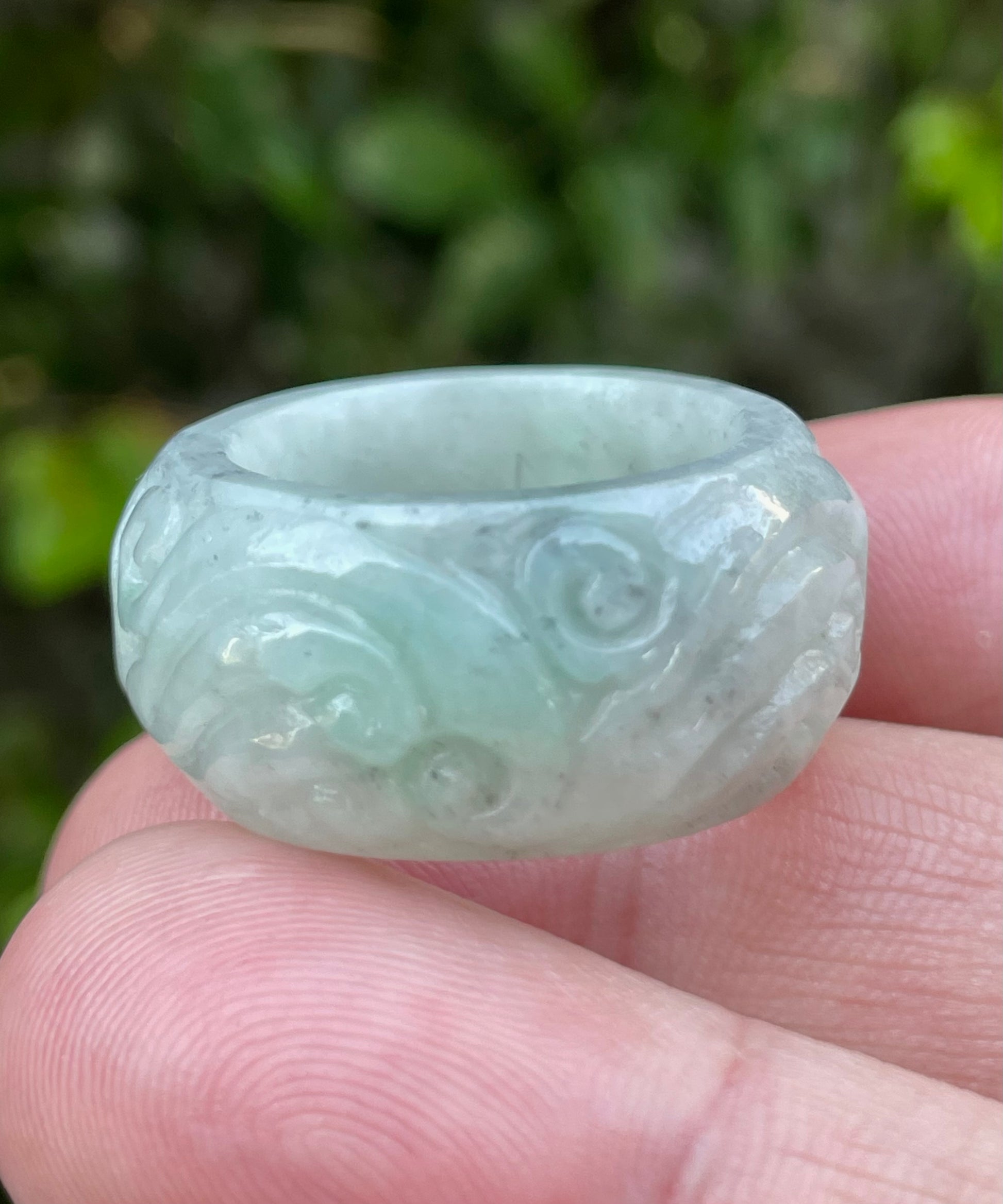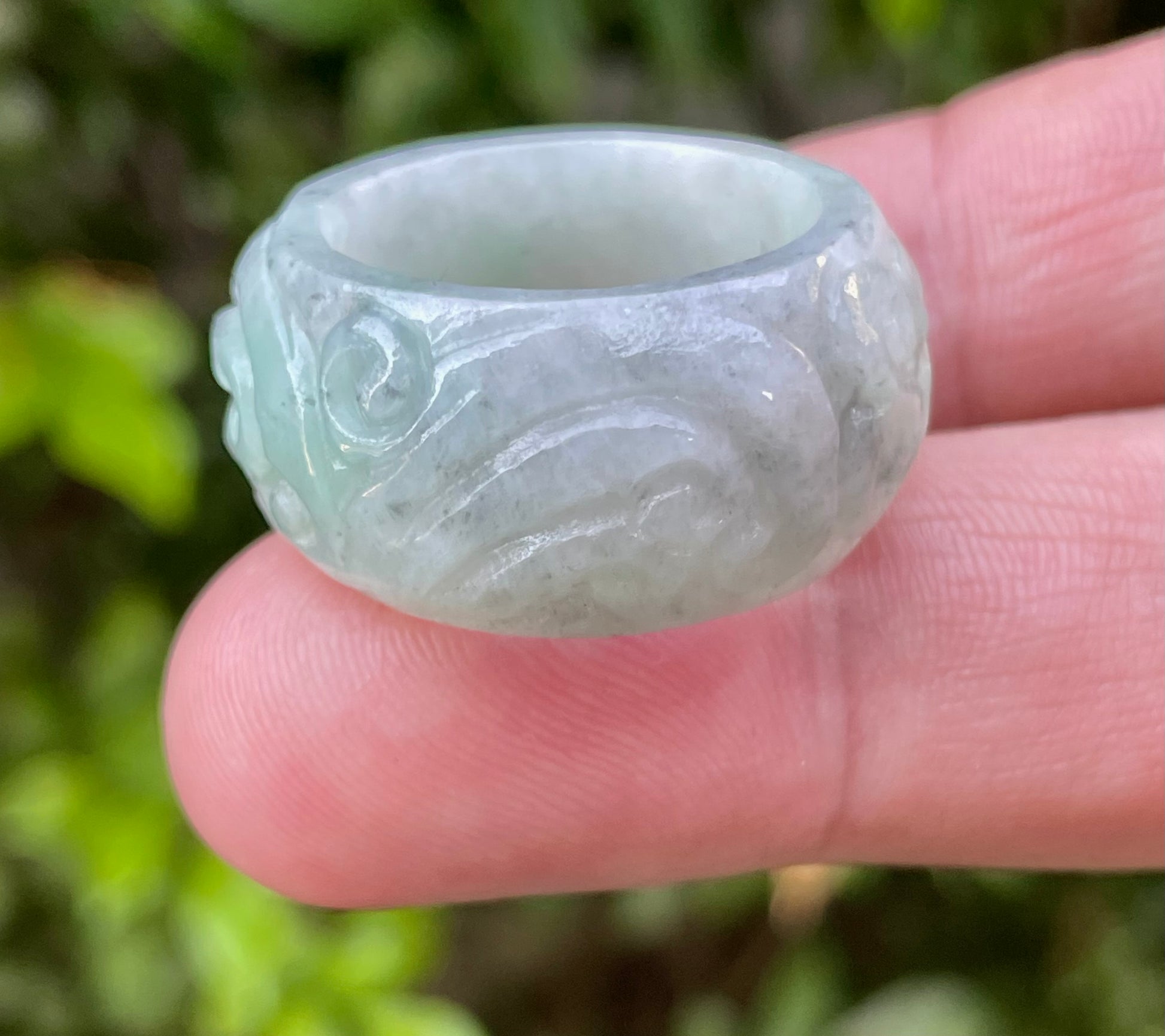Natural Burmese Jadeite Jade Ring – Icy Bluish Apple Green – Hand-Carved Swirl Motif – Wide Thumb/Band Style – JRN039
