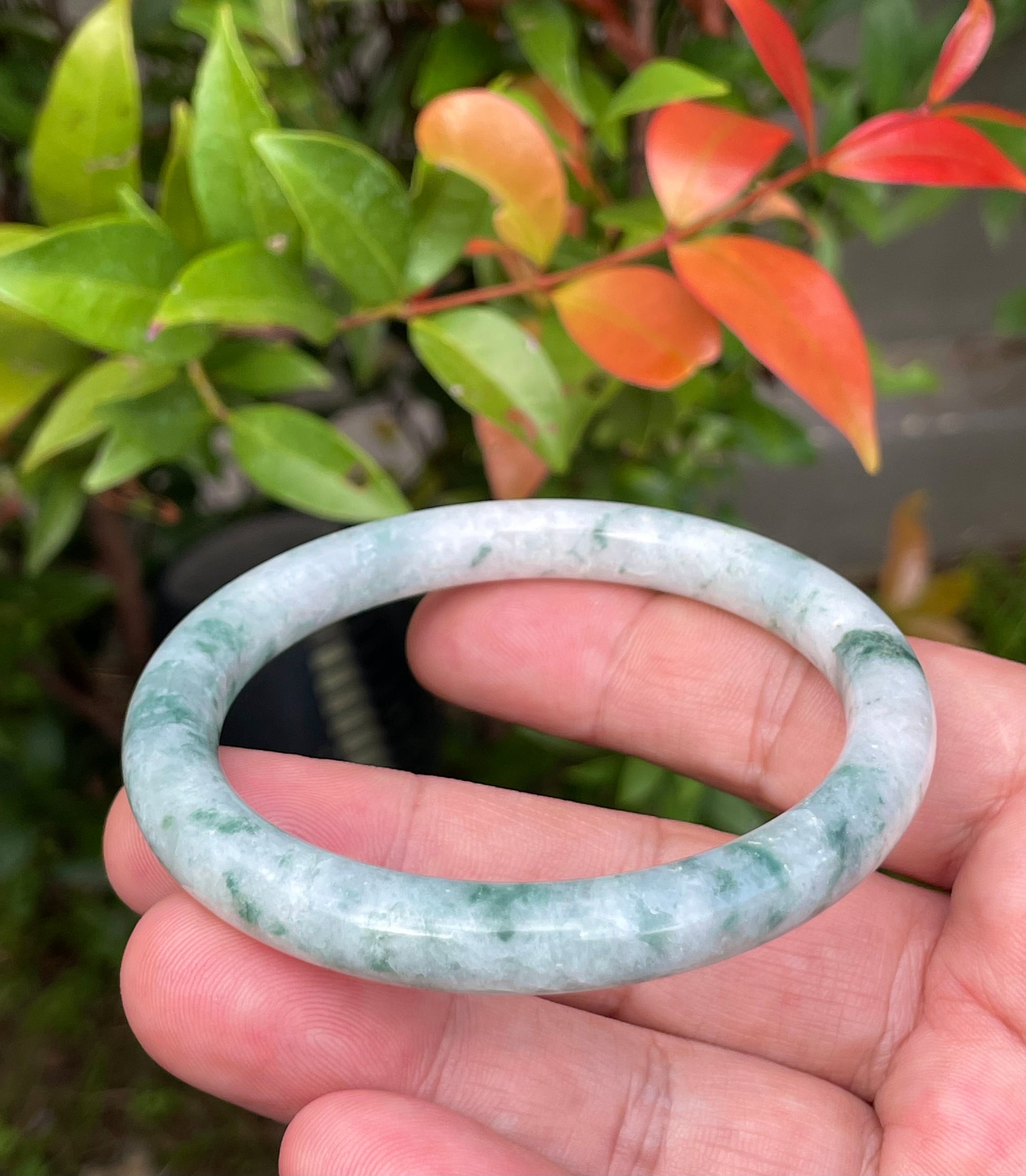 This jade bangle is handmade from 100% genuine and natural jadeite jade, ethically sourced from Myanmar (Burma)—the most prized origin for high-quality jadeite. It features a refreshing icy bluish base infused with soft milky white tones and rich imperial green veining. The thin, rounded profile is both lightweight and comfortable for everyday wear while preserving a timeless elegance.