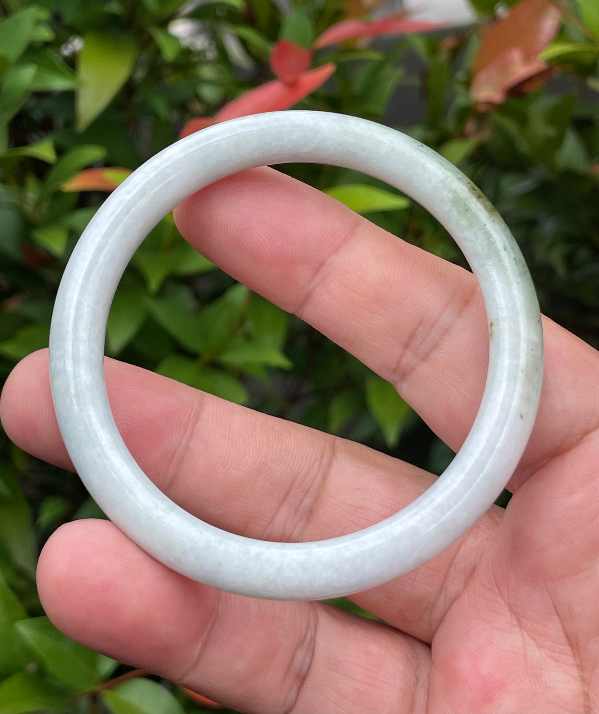 This jade bangle is handmade from 100% genuine and natural jadeite jade, ethically sourced from Myanmar (Burma)—the most esteemed origin for high-quality jadeite. The bangle features a delicate blend of icy milky white with elegant moss green hues, giving it a fresh, tranquil appearance that is soothing and versatile. Its slim, rounded princess cut ensures a lightweight and comfortable fit, perfect for daily wear or meaningful gifting.