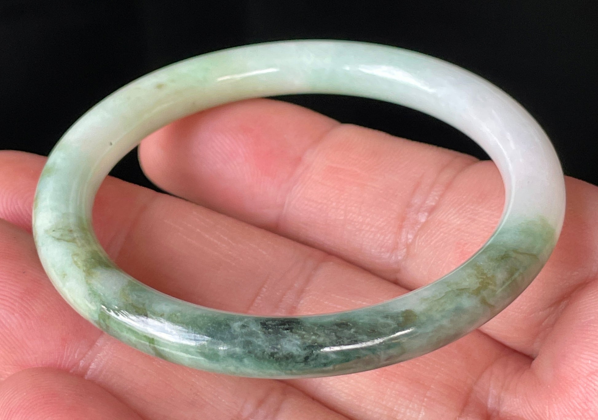 This genuine jadeite jade bangle is expertly hand-carved from 100% natural Burmese jadeite, showcasing a luminous mix of icy milky white with beautiful forest, apple, and imperial green hues swirling through its fine-grained body. Its semi-translucent appearance brings a fresh, serene energy, while subtle jade veins highlight its authenticity and natural formation.