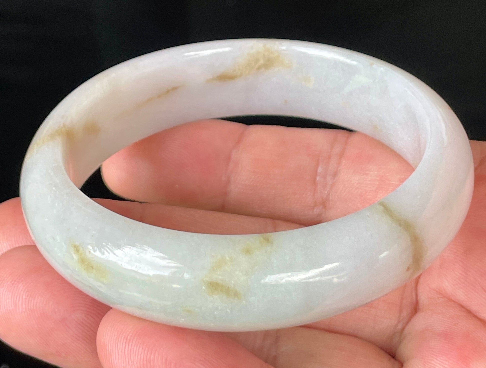 This genuine jadeite jade bangle is expertly handcrafted from 100% natural jadeite sourced directly from Myanmar (Burma). The bangle features a serene blend of icy milky white with captivating honeycomb orange hues and delicate jade veins running throughout. Its luminous, glassy surface and fine crystalline texture create a tranquil yet earthy elegance that glows beautifully in natural light.