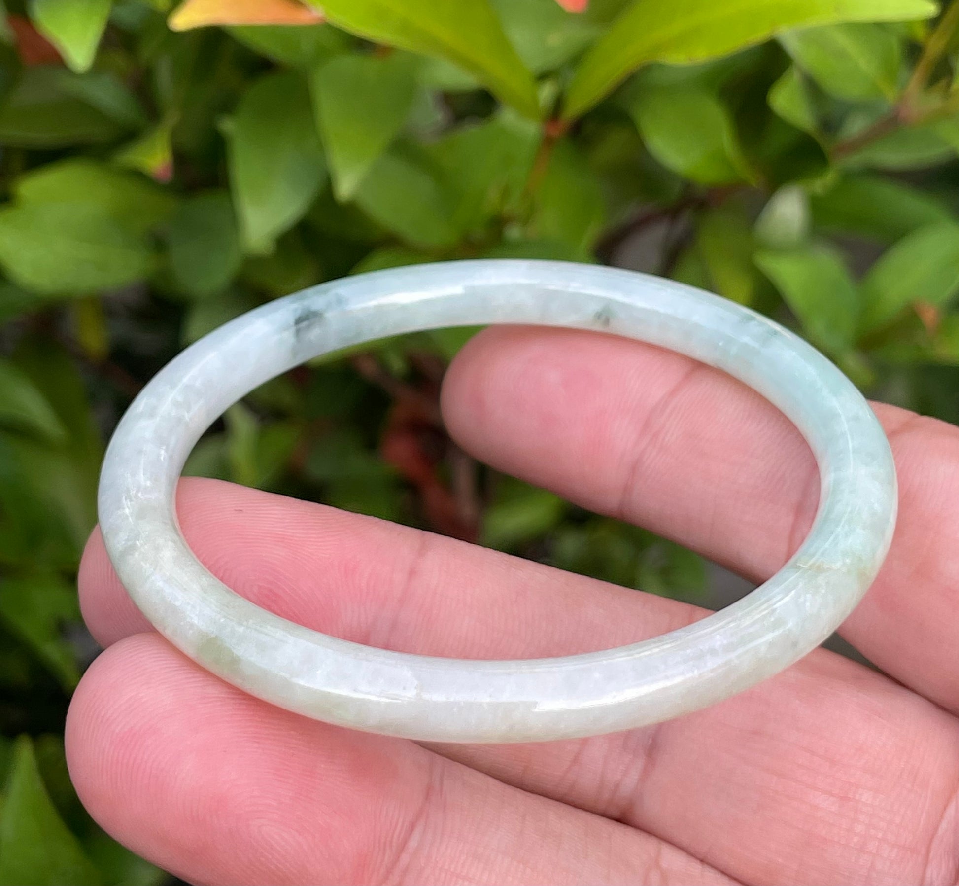 This jade bangle is handmade from 100% genuine and natural jadeite jade, ethically sourced from Myanmar (Burma)—the world’s most prized origin for top-quality jadeite. It features a tranquil blend of icy milky white with bluish green and gentle yellow hues, highlighted by a thin, rounded princess cut for lightweight, all-day comfort.