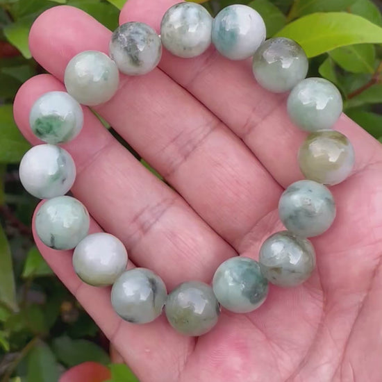 The 13.5mm round beads offer a substantial and grounding feel on the wrist. The subtle interplay of greens and whites gives this bracelet a distinctive, organic beauty, making it both a meaningful adornment and an elegant statement piece.