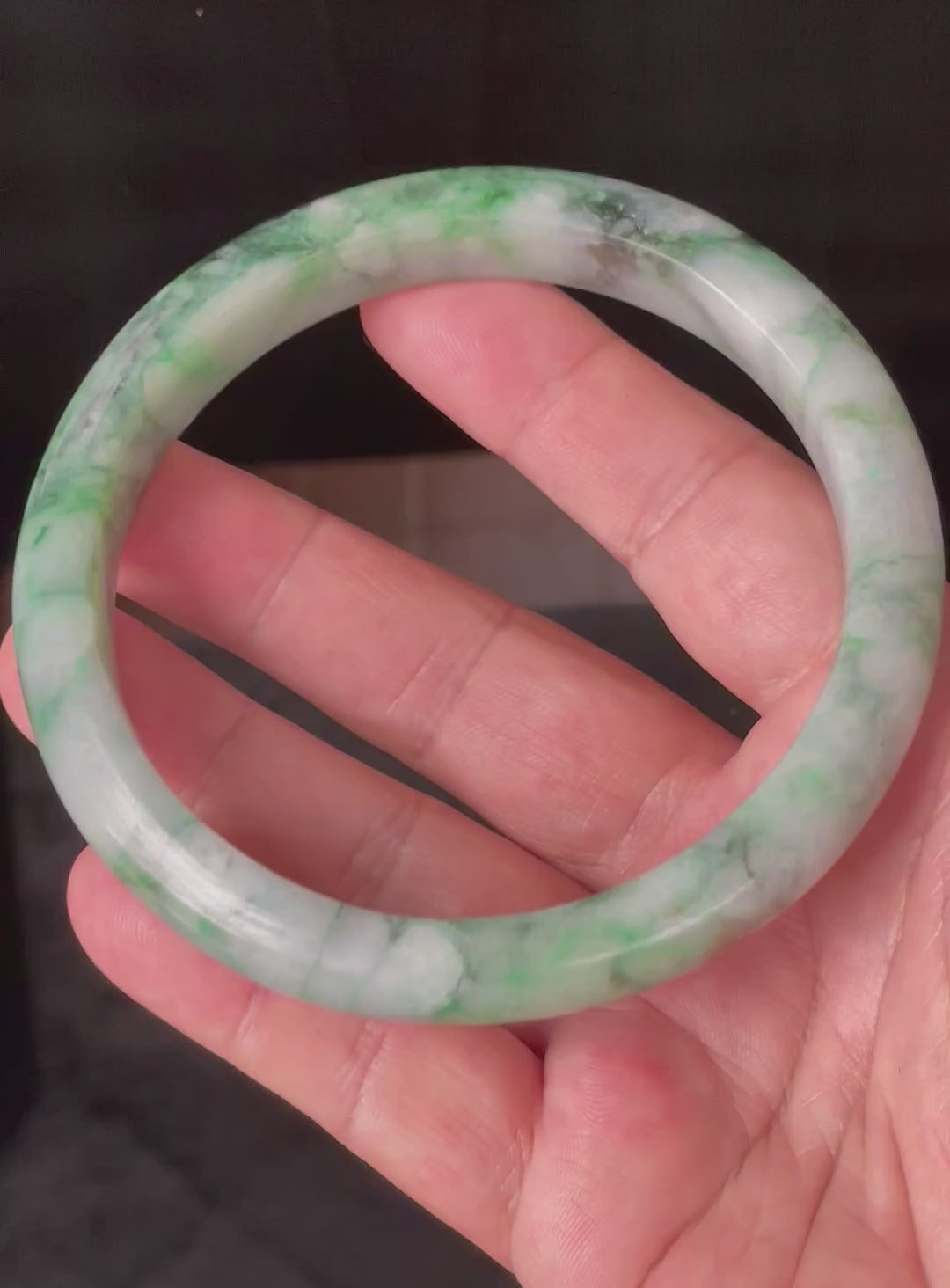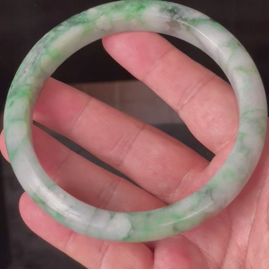 This genuine jadeite jade bangle is expertly handcrafted from 100% natural Burmese jadeite. The bangle features a large, bold profile with striking icy imperial and apple green hues that blend beautifully into areas of soft greyish milky white. The lively floral design and natural color transitions create a refreshing, energetic, and harmonious appearance. The beautiful colors transition harmoniously throughout the bangle, giving it a serene, refreshing presence and a fine crystalline texture that glows in natural light. A faint “moss in the snow” effect can also be seen.