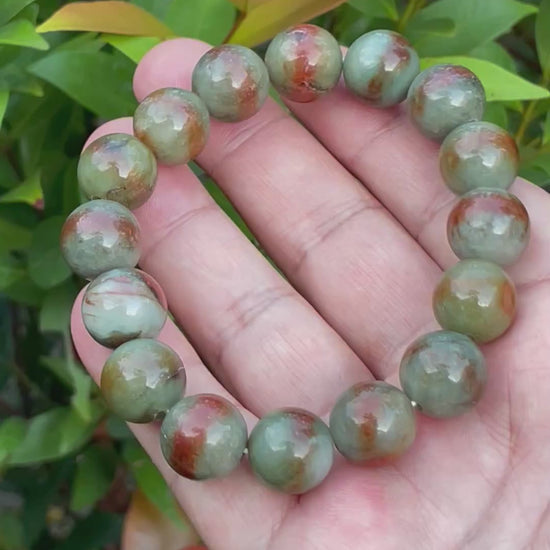This bracelet is handcrafted from 100% genuine and natural jadeite jade, ethically sourced from Myanmar (Burma). It showcases rich, earthy tones in a unique tricolor mix of bluish apple green, moss green, and reddish cinnamon hues, blending nature’s essence into a powerful, grounding piece of jewelry.