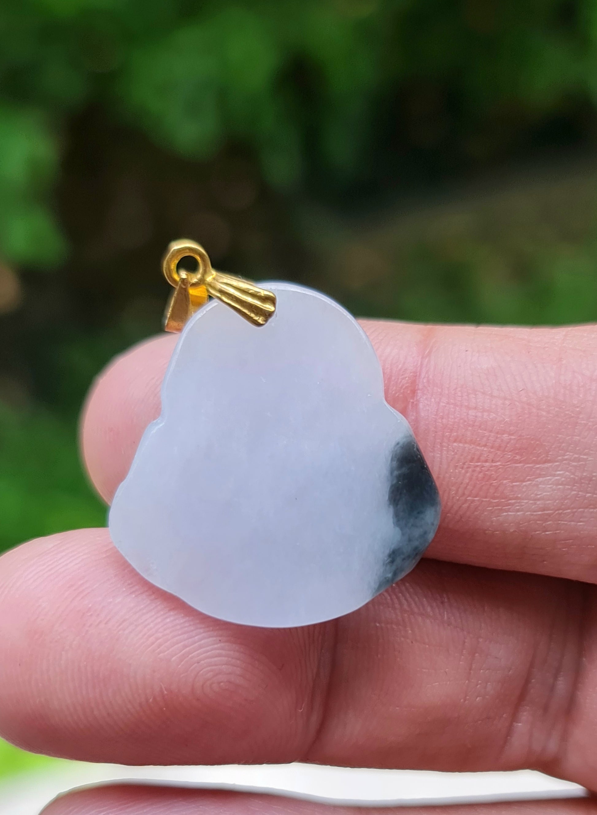 This joyful pendant is hand-carved from 100% genuine and natural jadeite jade, ethically sourced from Myanmar (Burma)—the most esteemed origin for high-quality jadeite. The piece features a serene base of icy milky white jadeite, infused with a natural emerald green splash along one side, creating a beautiful contrast and spiritual harmony.